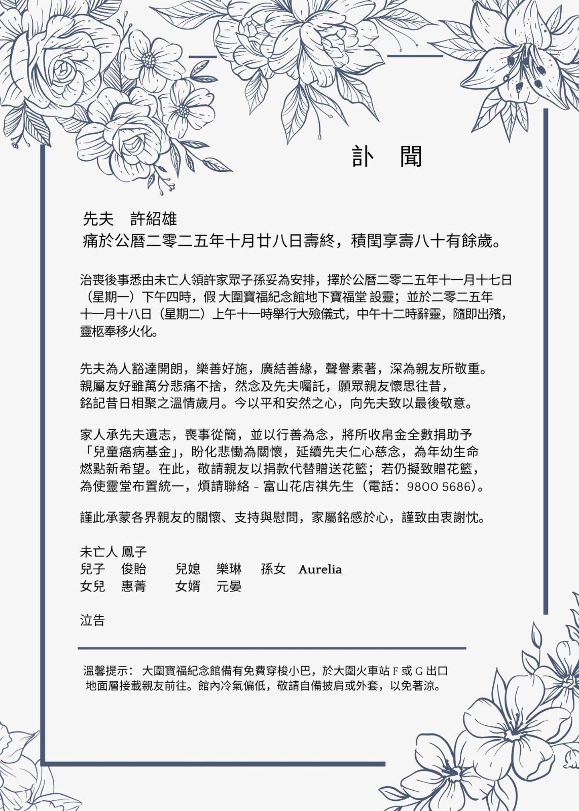訃聞稱「先夫為人豁達開朗,樂善好施,廣結善緣,聲譽素著,深為親友所敬重。親屬友好雖萬分悲痛不捨,然念及先夫囑託,願眾親友懷思往昔,銘記昔日相聚之溫情歲月。今以平和安然之心,向先夫致以最後敬意」。家人承許紹雄遺志,喪事一切從簡,並以行善為念,將所收帛金全數捐助予 「兒童癌病基金」,盼化悲慟為關懷,延續許紹雄仁心慈念,為年幼生命燃點新希望,敬請親友以捐款代替贈送花籃。