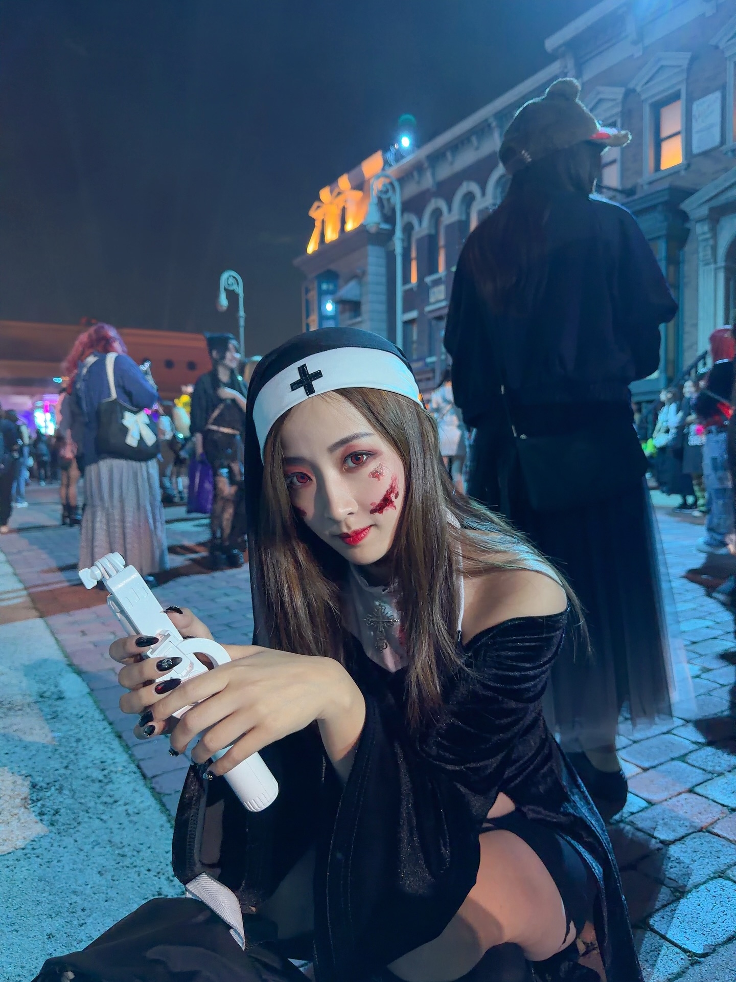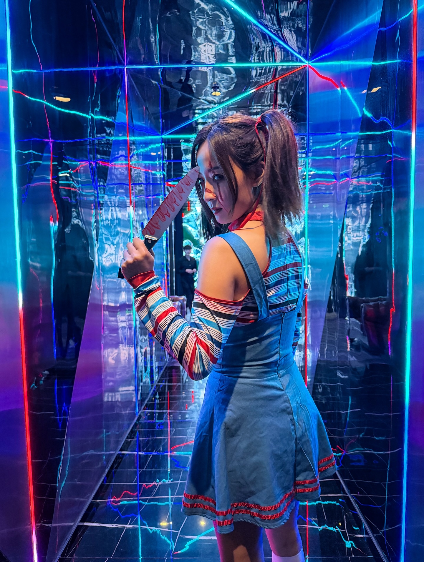 而之後佢返港,又同好友人化身成為《娃鬼回魂》孖妹,佢同好友齊齊入戲著晒吊帶裙加間條上衣,加上一面血跡加上手持利刀,真係幾可愛都要掉頭走呀。