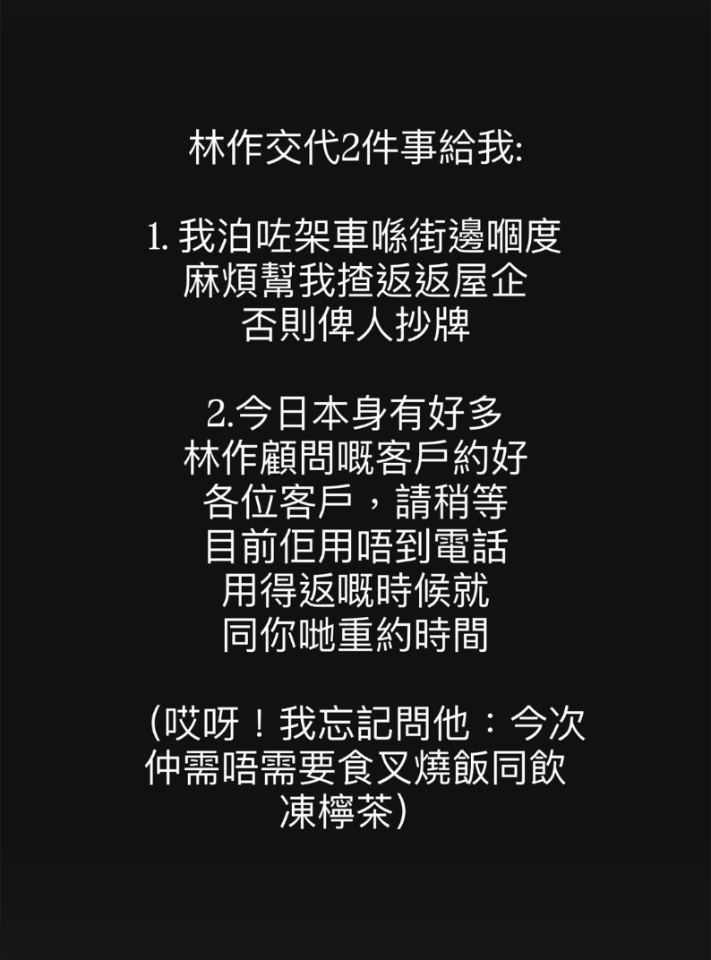 裕美指林作交待佢將泊於街頭嘅座駕揸走,而其他已與林作預約嘅客戶則需改期重約,更「幽默」指唔記得問男友需唔需要如上次扣留一樣,要代買叉燒飯凍檸茶。裕美又指警方記者會後,已經有記者登門採訪,佢明白傳媒需求,唯對大廈保安不滿。