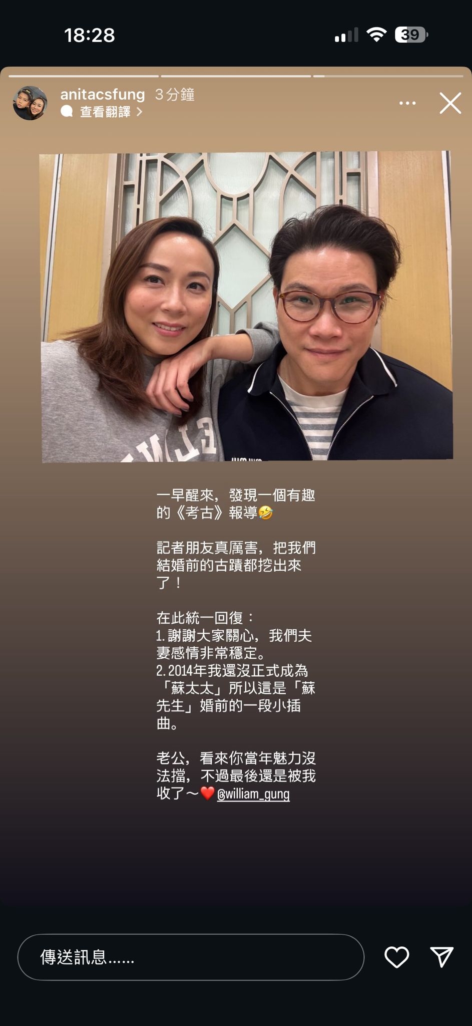 最後再以一句話將整件事總結,Anita話:「老公,看來你當年魅力沒有法擋,不過最後還是被我收了~」巧妙大氣化解今次事件。
