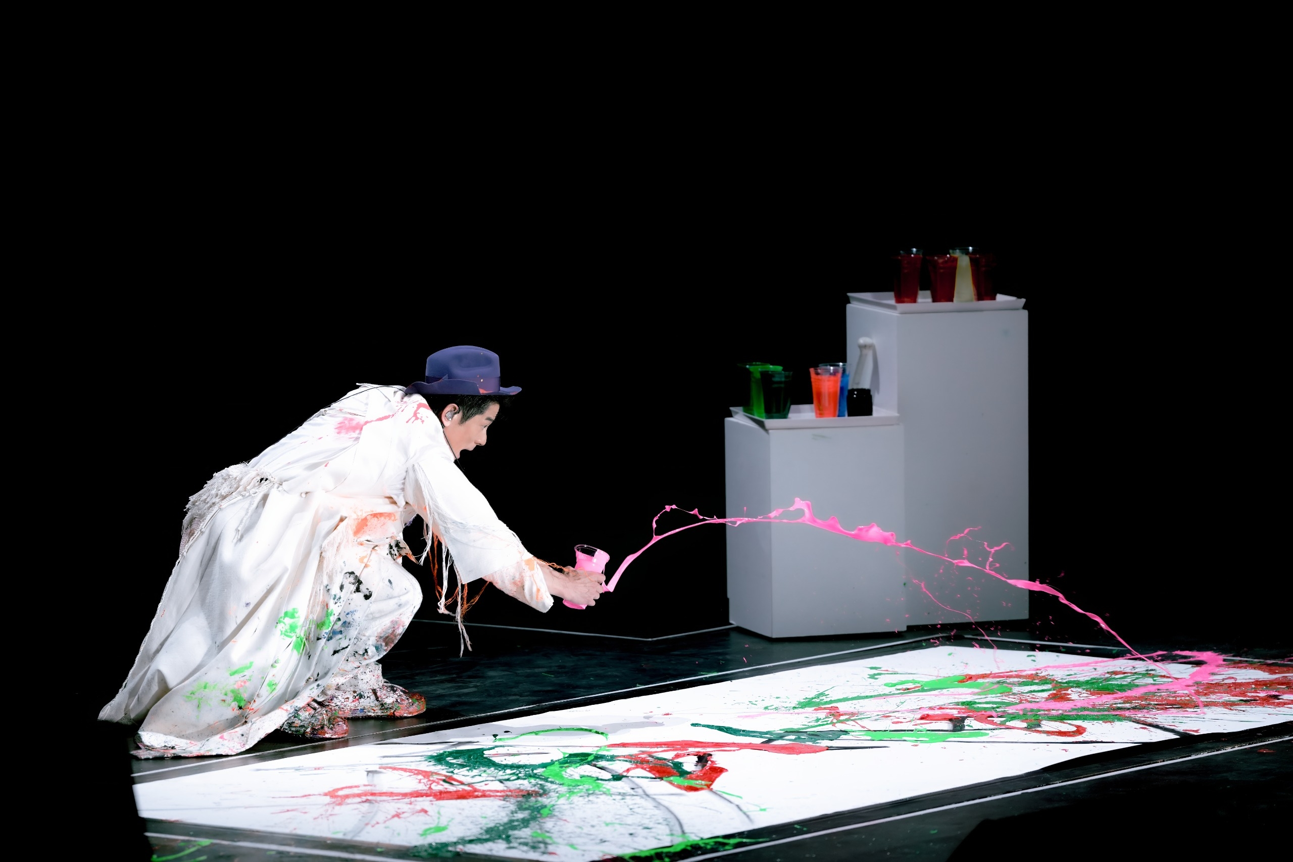 唱至中場,城城又將觀眾帶入自己嘅巨型畫室,即場潑油彩作畫、邊唱《分享愛》。