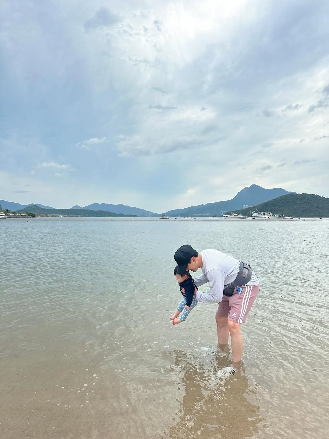 爸爸阿蕭抱起囝囝蜻蜓點水式玩水,令蕭哈哈不知幾開心。其中一張合照就曝光BB正面,眼仔睩睩嘅神髓同媽媽餅印一樣,獲網友大讚蕭哈哈好靚仔。見到阿仔呢個表現,作為父母當然好開心,阿蕭都留言大讚蕭哈哈好勇敢又唔怕沙,而且非常喜歡海水,仲搞到爸爸條褲濕晒。