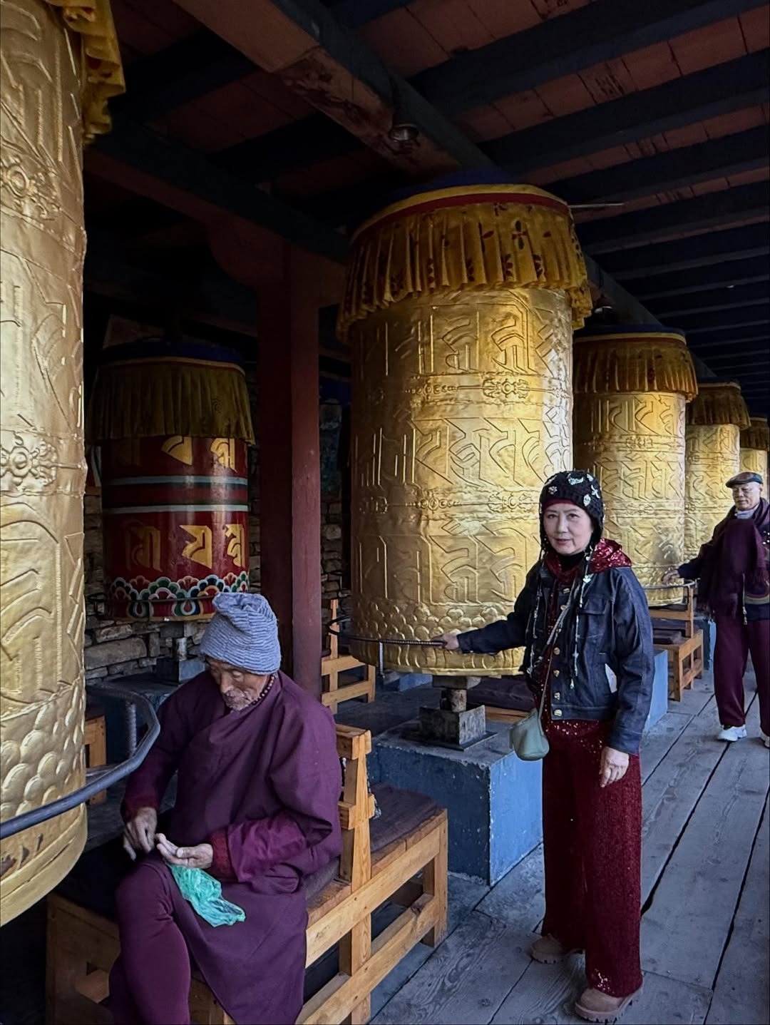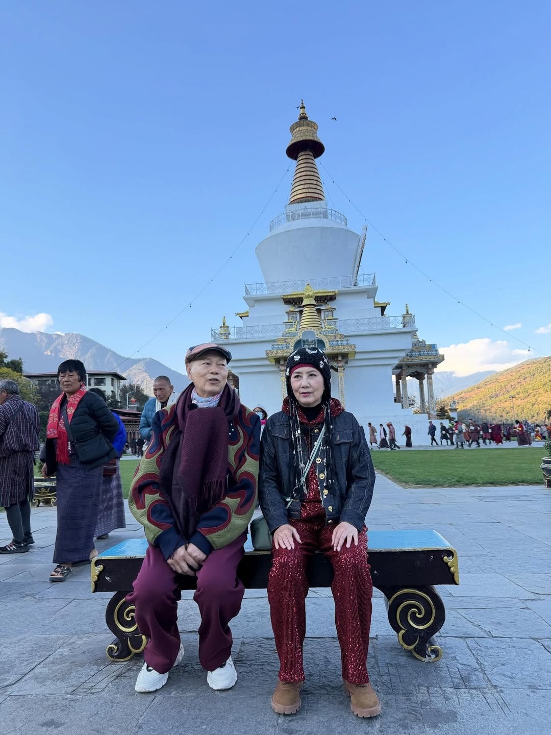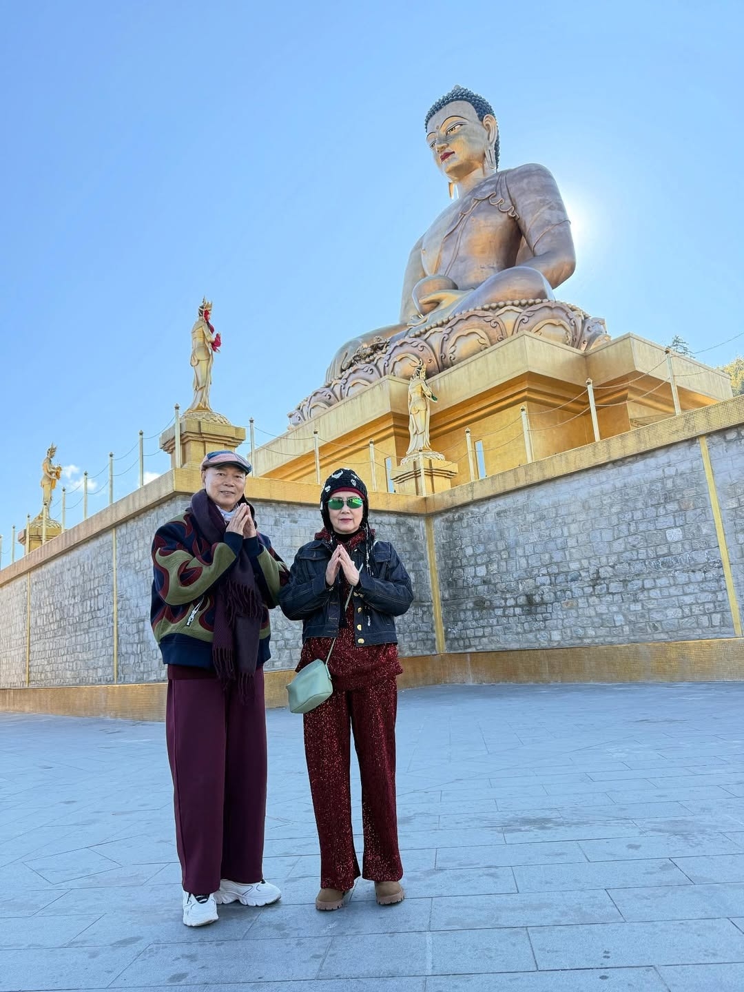 家英哥喺行程中對阿姐好貼心,處處常伴阿姐左右互相照應,其中一站兩夫妻就登上坐落於廷布谷南邊山頂,高度51米嘅Buddha Dordenma,亦是世界上最大嘅坐姿佛像之一,佢哋又走訪國家紀念佛塔National Memorial Chorten,紀念不丹第三任國王,呢個地方係廷布人嘅心靈地標,每日都有本地人去轉經祈福,阿姐同家英哥亦入鄉隨俗跟住祈福。