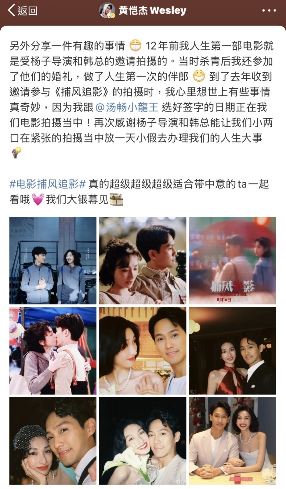 黃愷傑透露同湯暢喺今年七夕(8月29日)簽字結婚,當時佢哋一齊拍緊電影《捕風追影》,黃愷傑話結婚係人生大事,感激劇組允許佢哋小倆口喺緊張嘅拍攝中請假一日完成手續。![]()