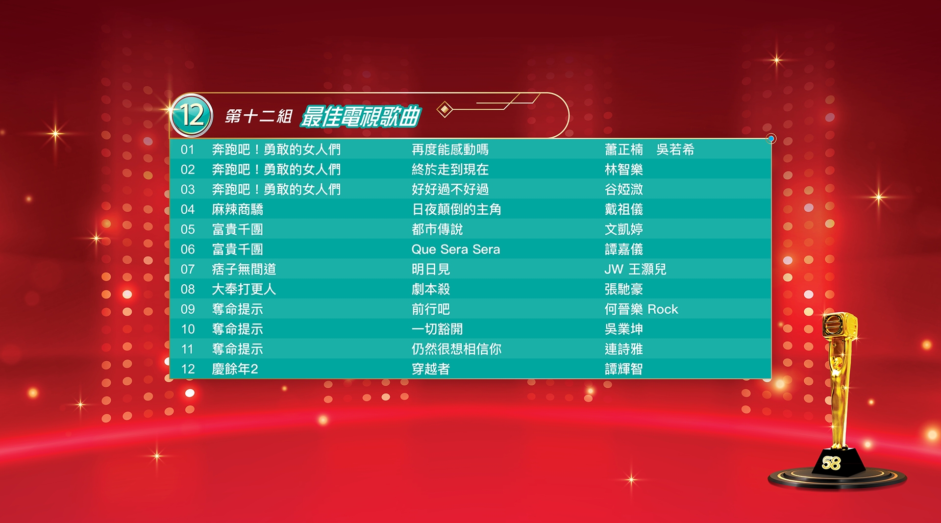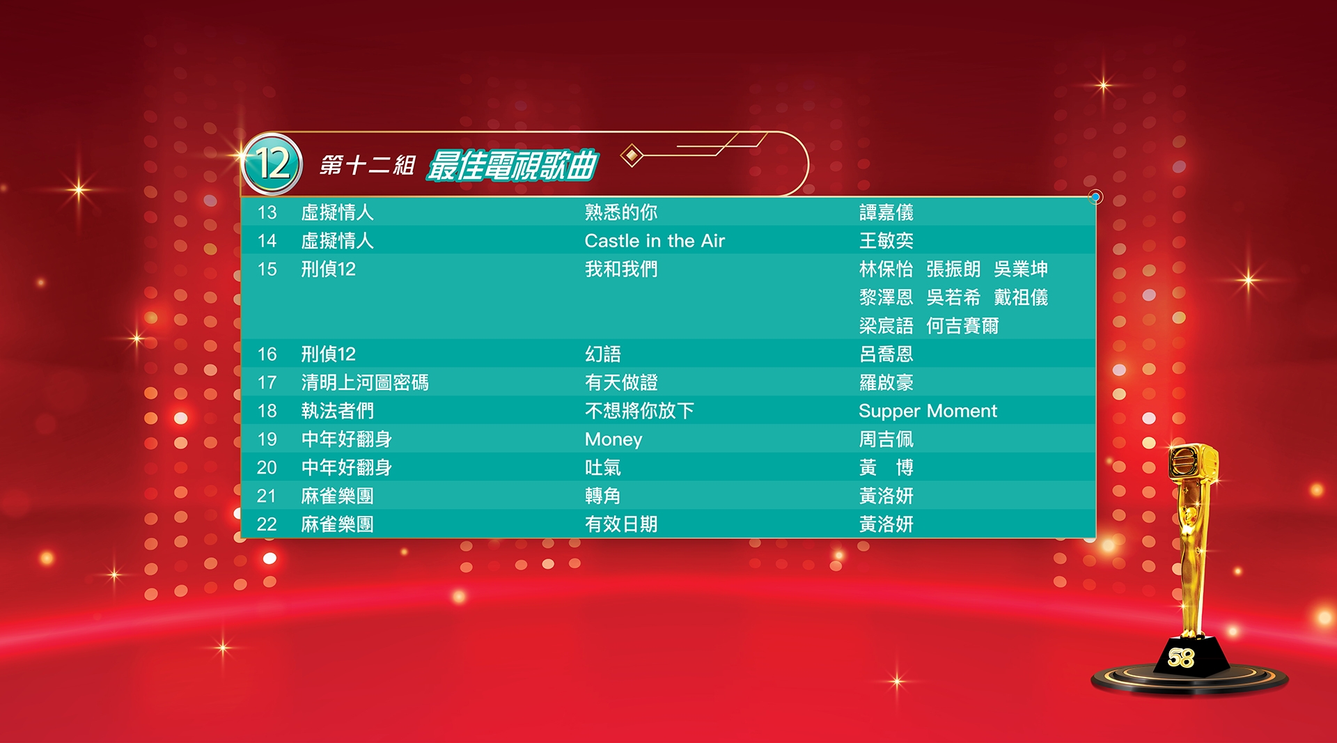 今年「最佳電視歌曲」嘅競爭亦相當激烈,幾位中聲唱將主唱嘅歌曲都有份入圍,周吉佩就話希望可以同黃博、張與辰齊齊得獎,張與辰就指觀眾有三票,投晒佢哋三個就啱啱好喇,佢仲指自己仲有幾套戰衣未著,希望大家可以投佢一票送佢到現場呀。指自己細細個就睇頒獎典禮嘅黃博,話每次見到唔同演員同歌手得獎,自己都好開心,今年到自己都有份入圍,佢覺得相當神奇。