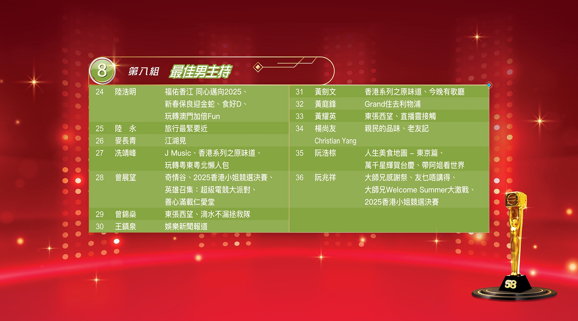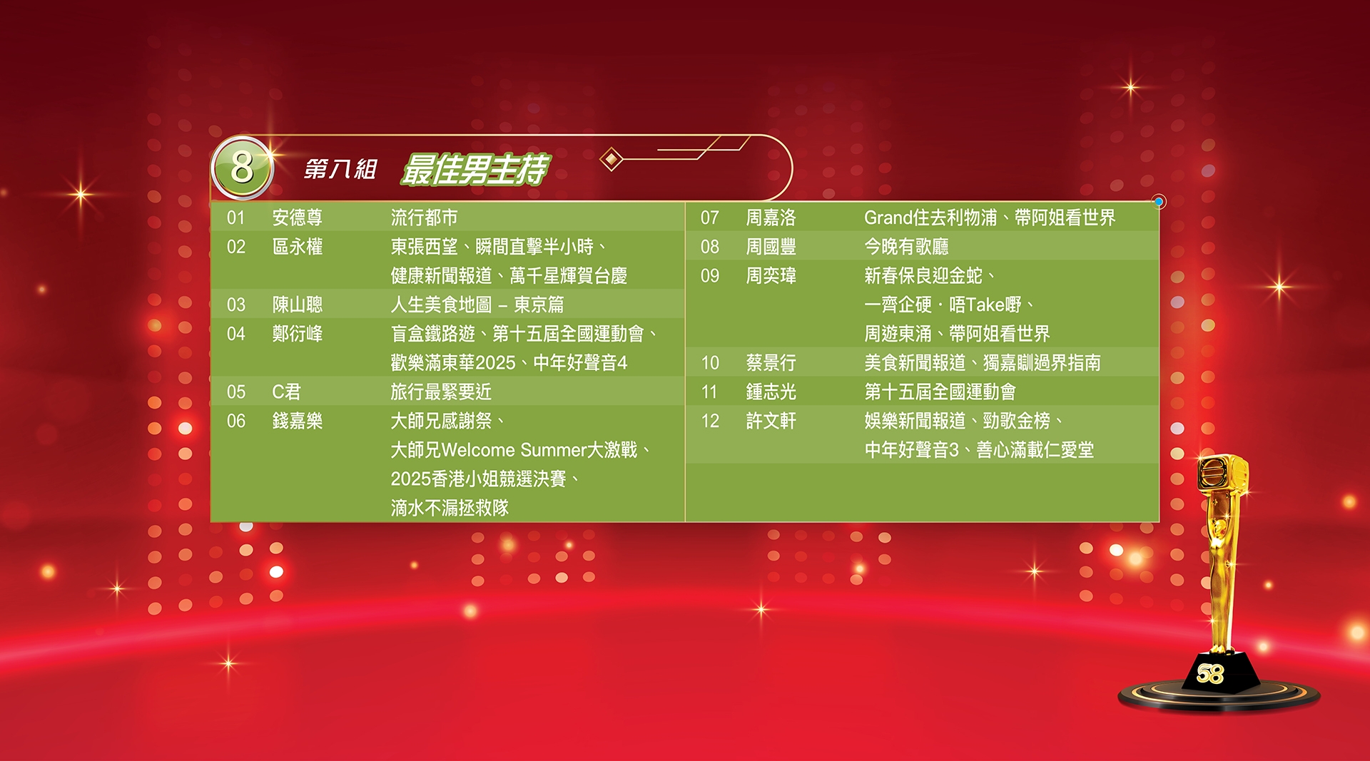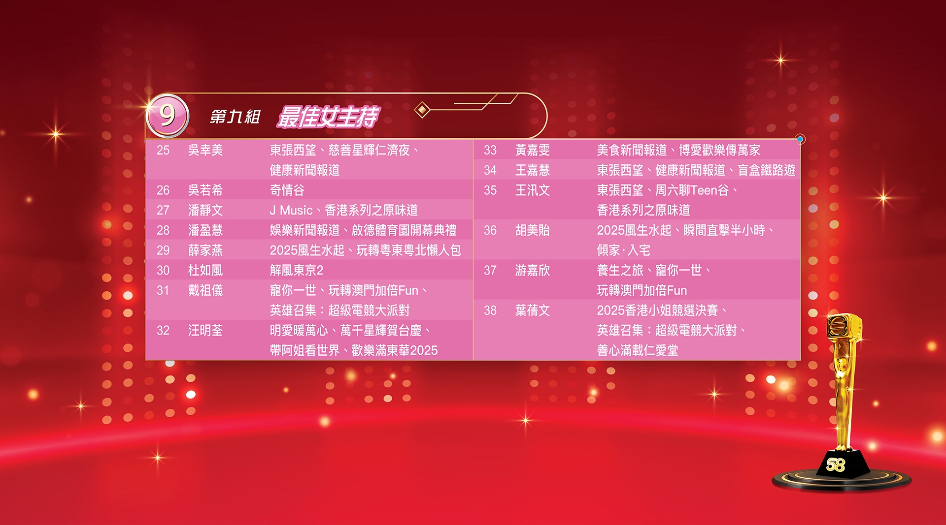 男女主持方面有老將亦有新丁,《娛樂新聞台》嘅三位主持 許文軒 潘盈慧 同 王鎮泉 今年繼續有份入圍, 同樣入圍「最佳男 / 女主持」嘅 冼靖峰 ,就話遇到呢三位前輩就已經冇得鬥。 阿盈指再次以《娛樂新聞台》主持身份入圍相當開心,因為一直以嚟大家都好努力,如今可以得到大家嘅肯定,相當開心。泉叔就話自己繼續努力陪跑,佢又指今年最佳主持嘅提名名單陣容強勁。![]()