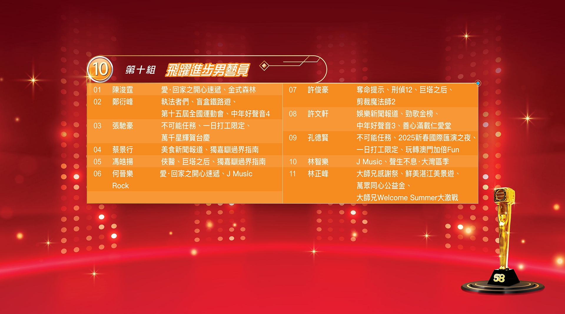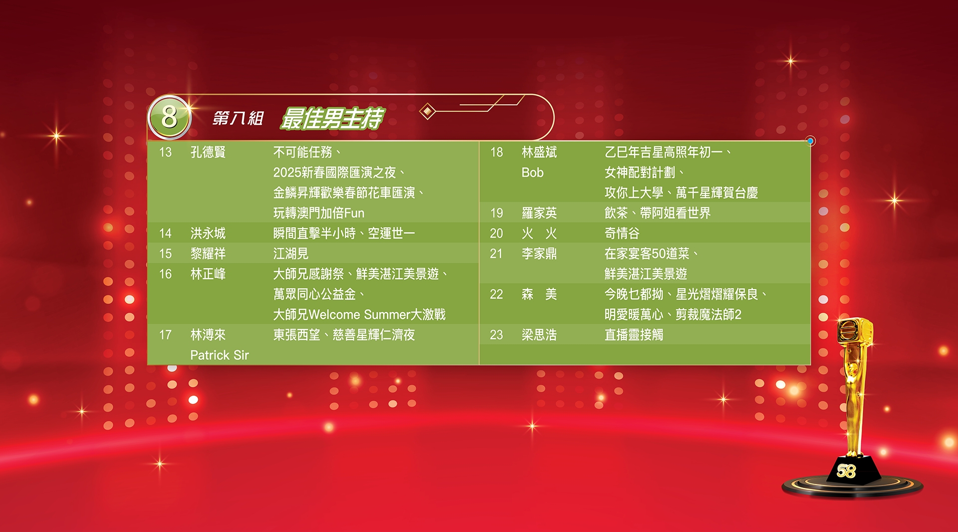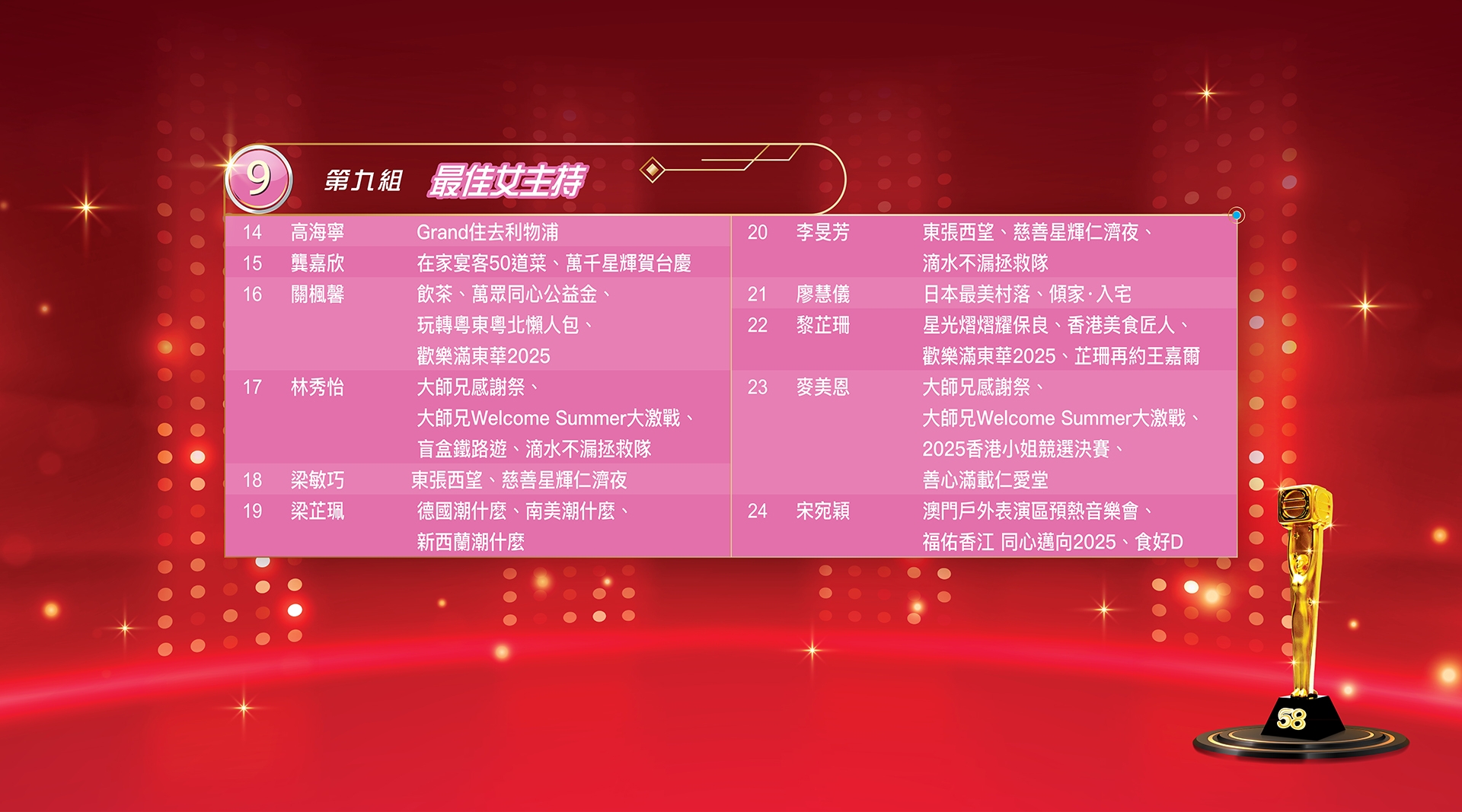 男女主持方面有老將亦有新丁,《娛樂新聞台》嘅三位主持 許文軒 潘盈慧 同 王鎮泉 今年繼續有份入圍, 同樣入圍「最佳男 / 女主持」嘅 冼靖峰 ,就話遇到呢三位前輩就已經冇得鬥。 阿盈指再次以《娛樂新聞台》主持身份入圍相當開心,因為一直以嚟大家都好努力,如今可以得到大家嘅肯定,相當開心。泉叔就話自己繼續努力陪跑,佢又指今年最佳主持嘅提名名單陣容強勁。![]()
