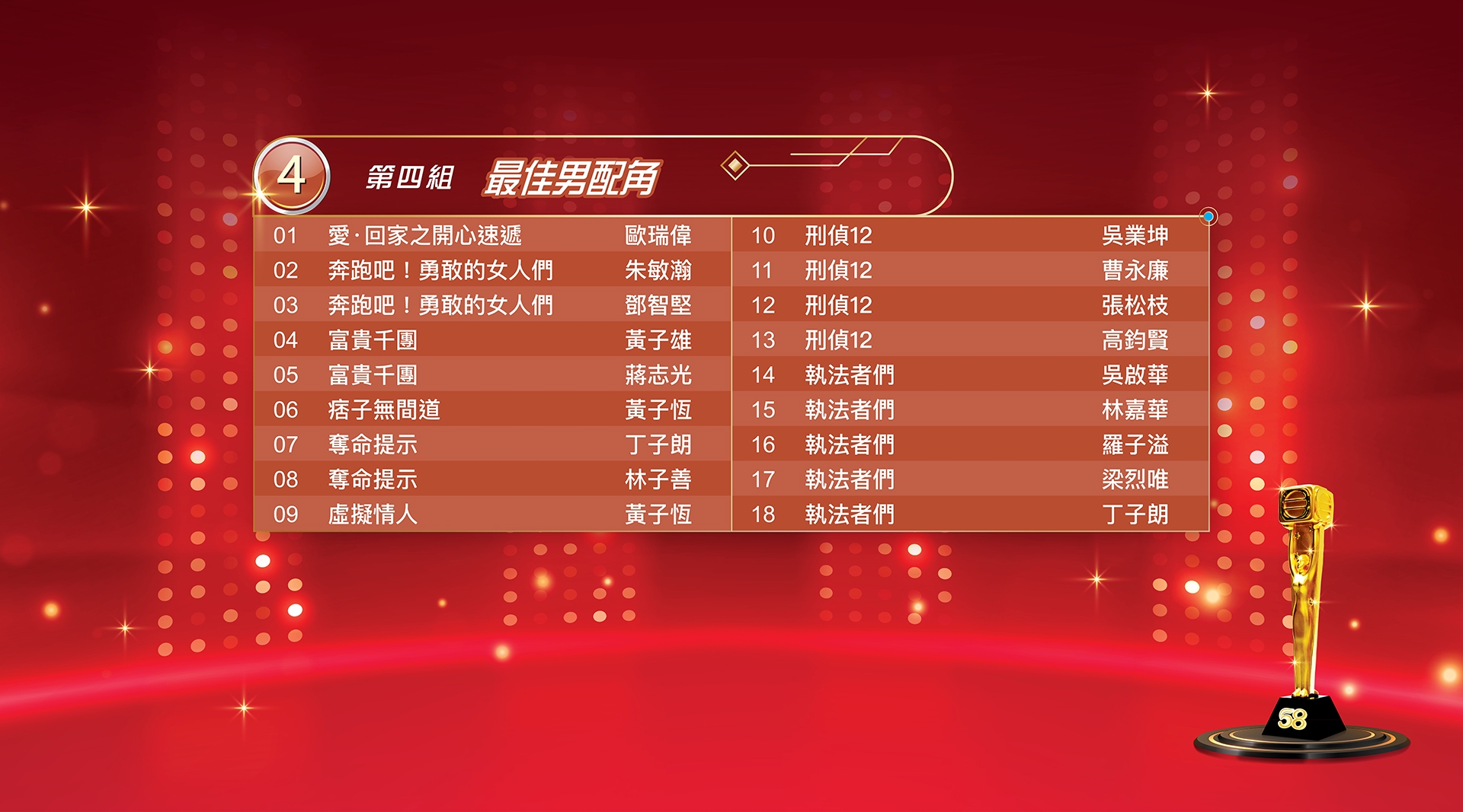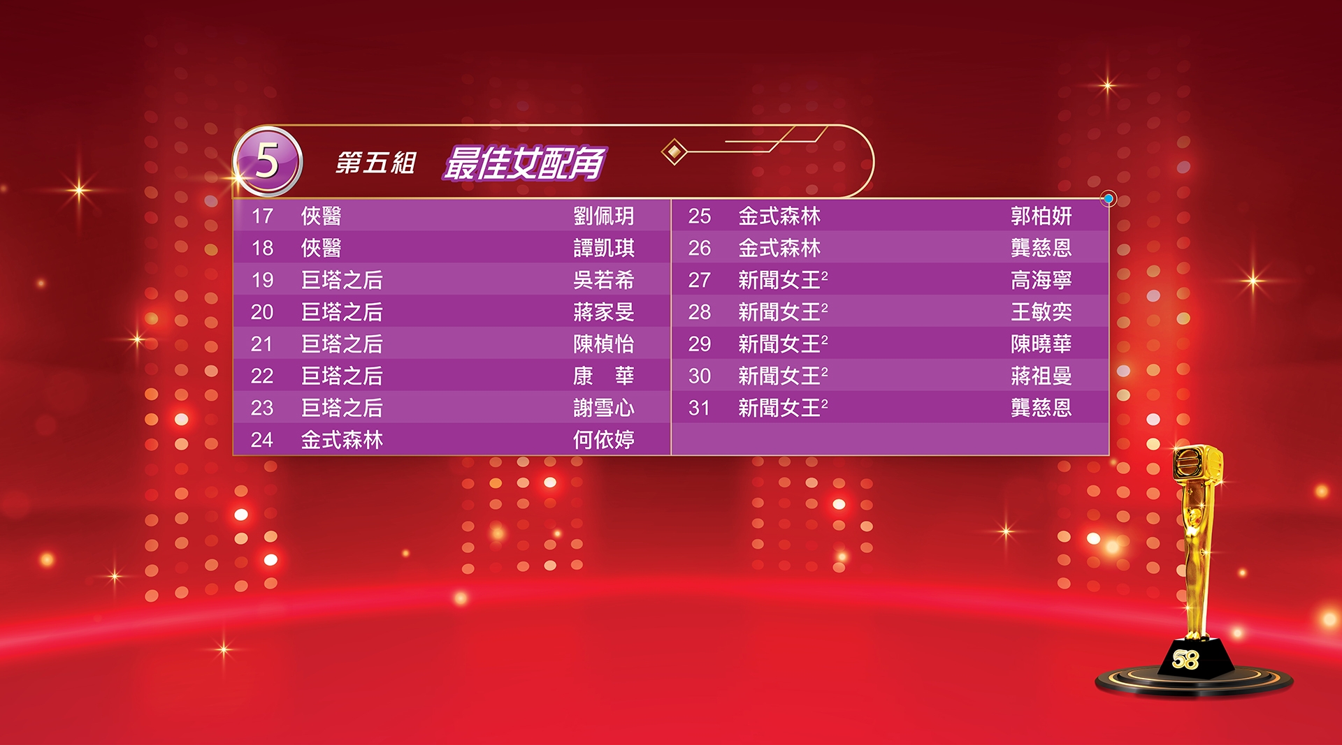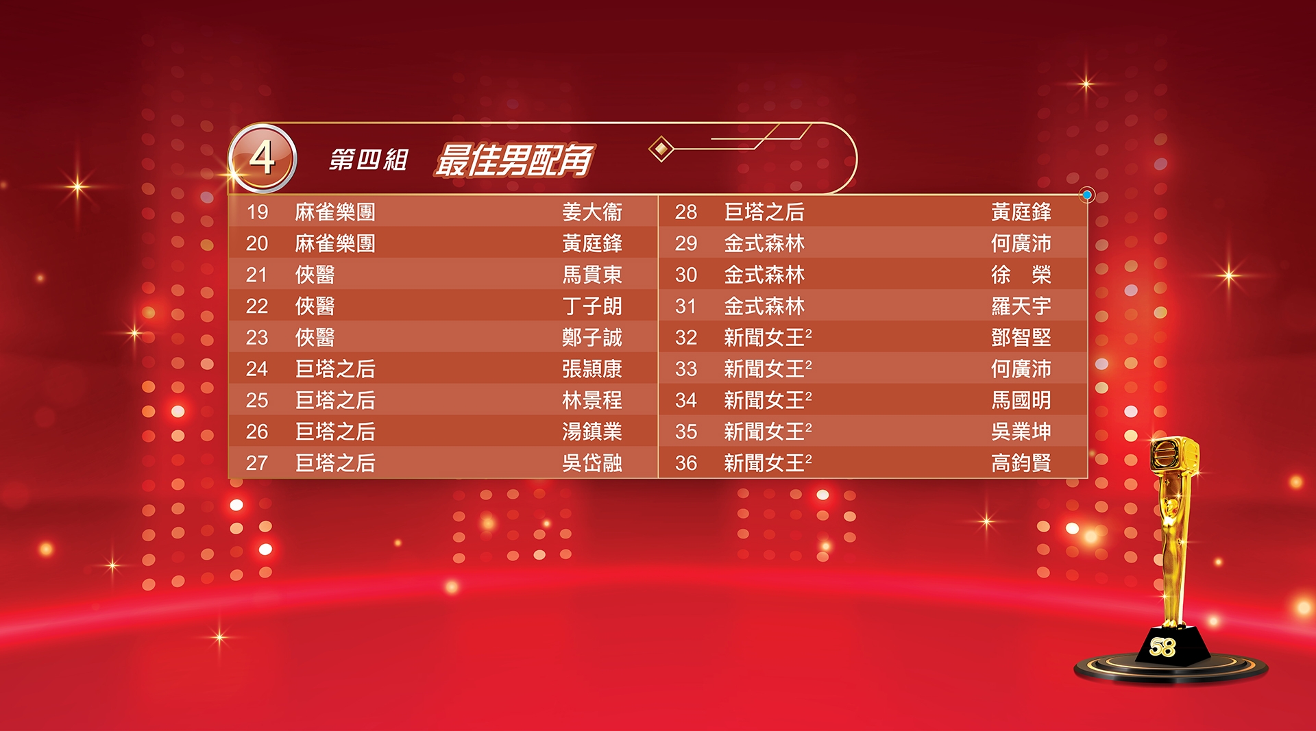 男、女配角同樣出現一人憑多劇入圍嘅現象, 丁子朗 同 郭柏妍 都一人有三個提名,何廣沛 鄧智堅 黃子恆 吳業坤 黃庭鋒 高鈞賢 劉佩玥 劉穎鏇 同 龔慈恩 就各有兩個提名。龔慈恩就話兩個角色都各有發揮機會,各有唔同層次同變化,所以好開心兩角都得到提名。譚凱琪就話覺得自己嘅角色可以再做好啲,但有提名都已經係當贏咗。 馬貫東 就話以平常心對待,因為佢已經完成咗畀自己嘅目標,至於能否攞獎就要靠觀眾。![]()