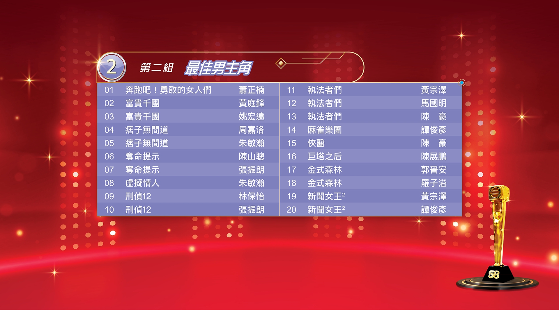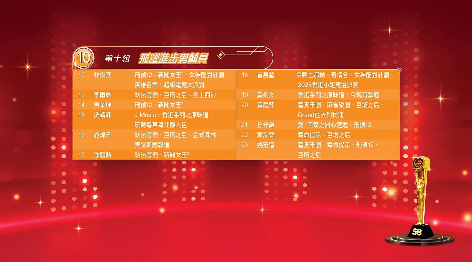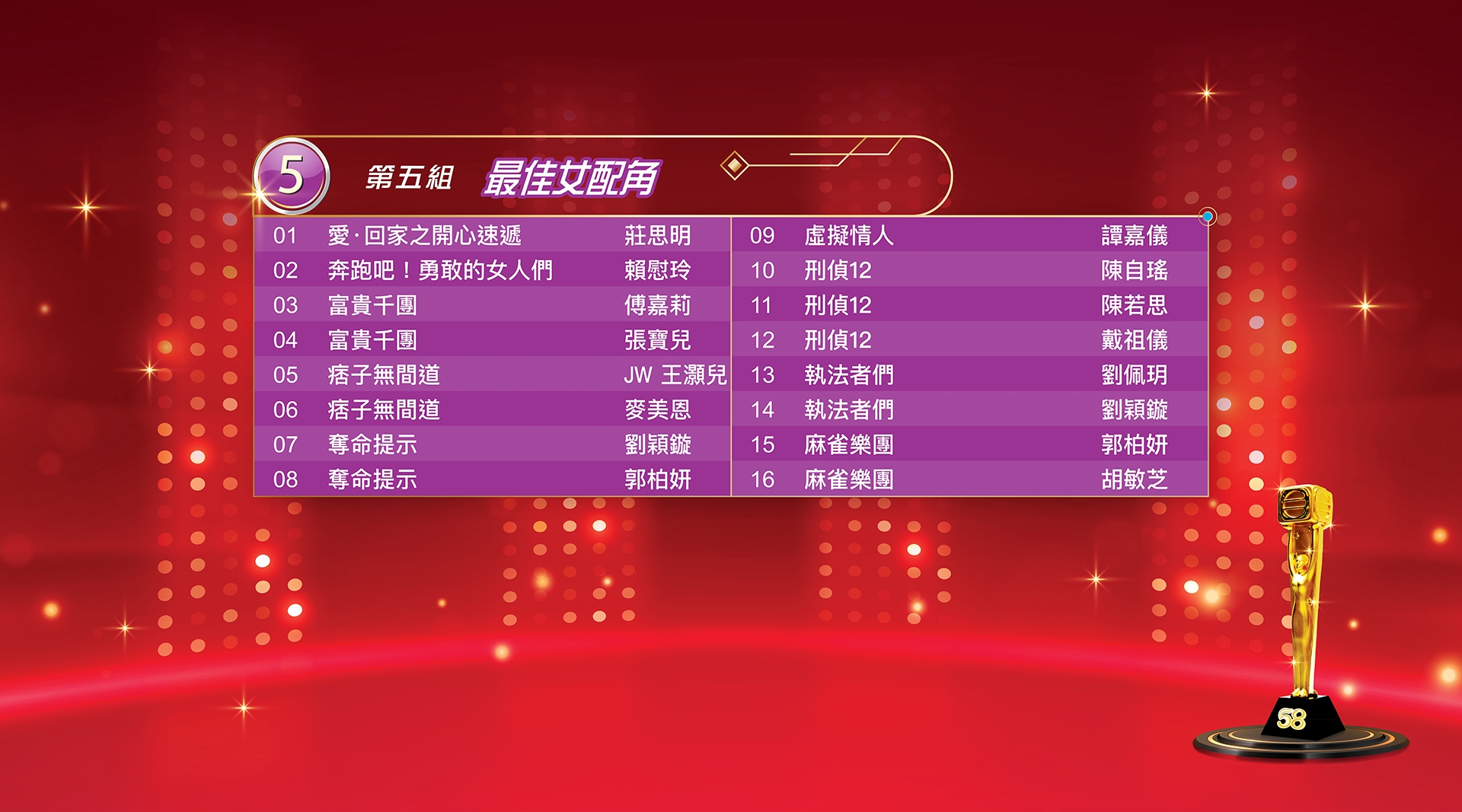 男、女配角同樣出現一人憑多劇入圍嘅現象, 丁子朗 同 郭柏妍 都一人有三個提名,何廣沛 鄧智堅 黃子恆 吳業坤 黃庭鋒 高鈞賢 劉佩玥 劉穎鏇 同 龔慈恩 就各有兩個提名。龔慈恩就話兩個角色都各有發揮機會,各有唔同層次同變化,所以好開心兩角都得到提名。譚凱琪就話覺得自己嘅角色可以再做好啲,但有提名都已經係當贏咗。 馬貫東 就話以平常心對待,因為佢已經完成咗畀自己嘅目標,至於能否攞獎就要靠觀眾。![]()