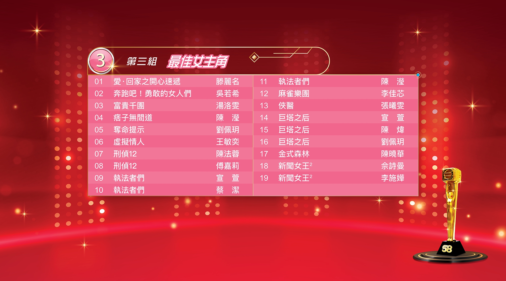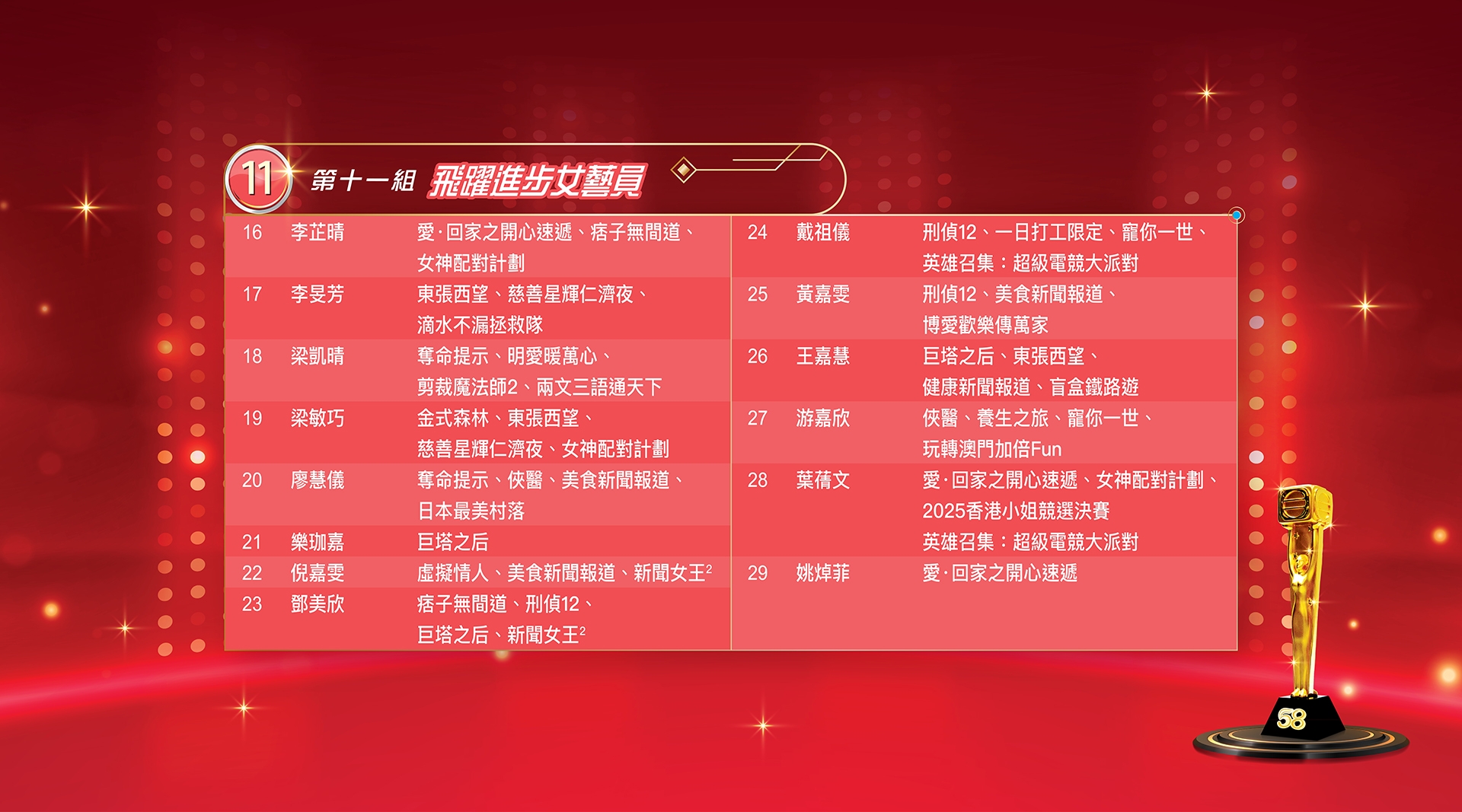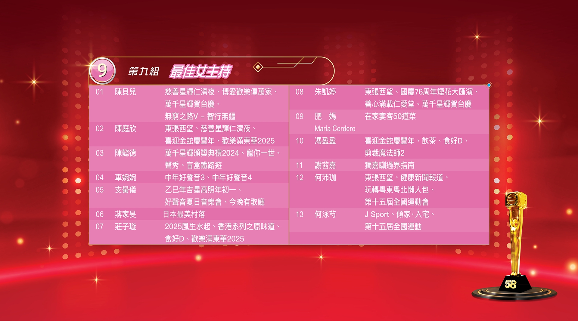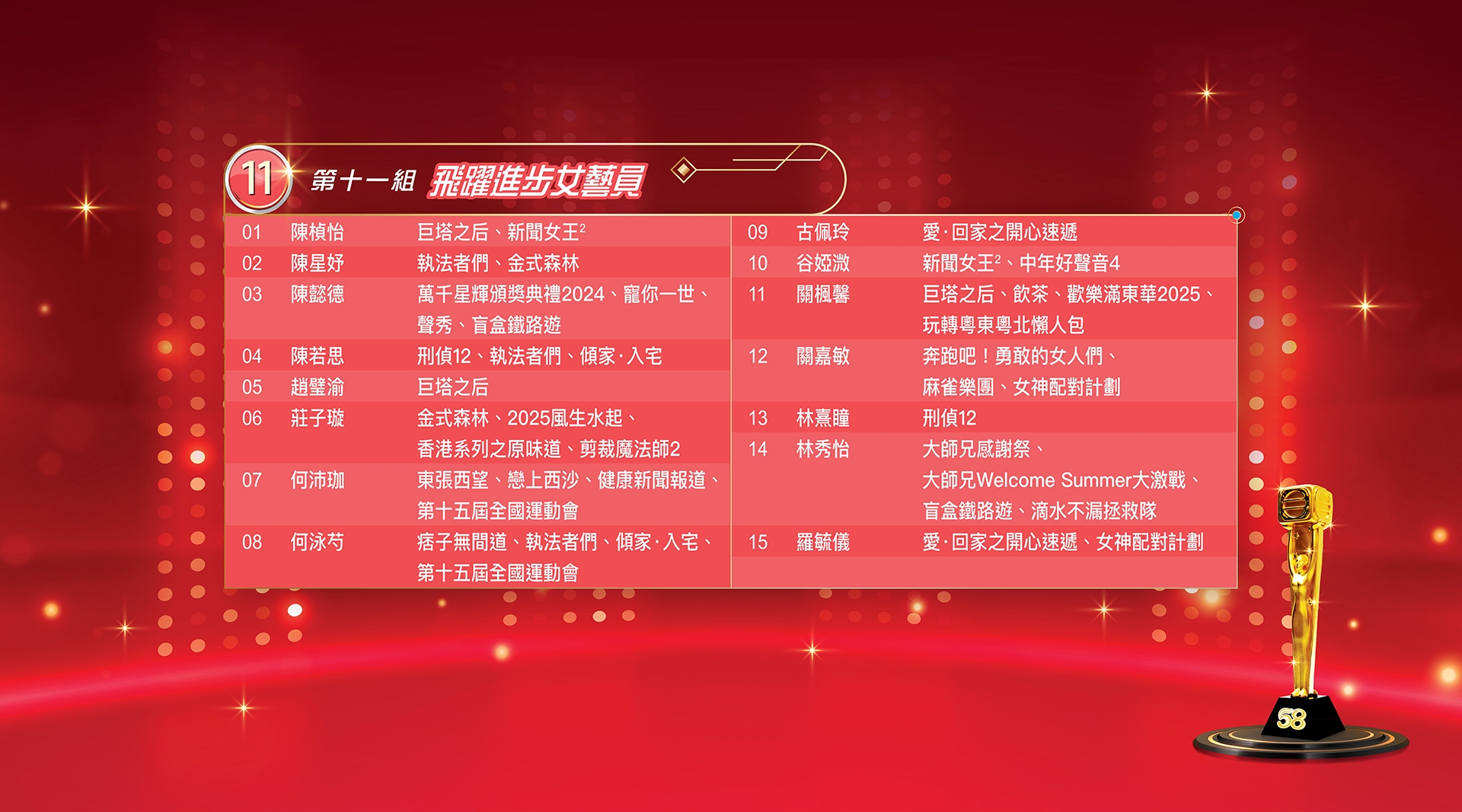 對於自己有幾個提名嘅何沛珈,就表示有提名就已經好開心,同時佢亦感激呢幾年來教導過佢嘅所有人。有三項提名在手嘅莊子璇,就話歌曲嘅係多得冼靖峰,佢先有得提名,至於「最佳女主持」嘅提名,佢就話係一個重擔,但同時亦好開心有多項提名。再次提名「飛躍進步女藝員」嘅陳楨怡,就指每年都有提名,就代表每一年都有進步,同時亦開心《巨塔之后》嘅角色,可以畀觀眾睇到另一面嘅自己呀。