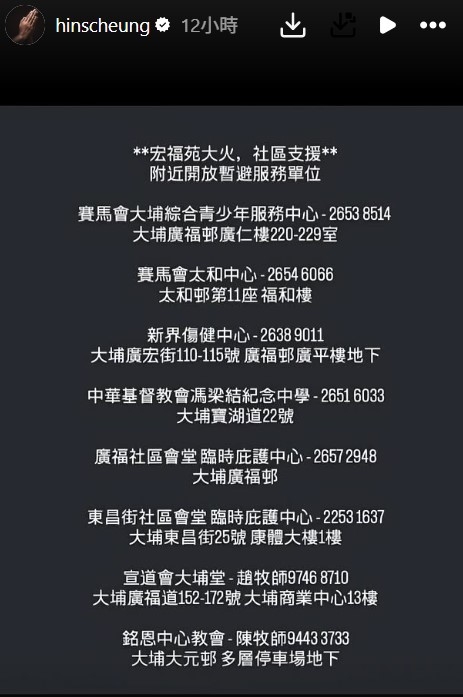張敬軒 集合「宏福苑大火社區支援資訊」,不斷更新至凌晨,亦更換頭像,轉換成一張雙手合十祈禱相片。 張繼聰 就轉載警方提供予傷者查詢資料嘅熱線。蔡卓妍同李逸朗等亦轉載社區協助資訊,期待為需要人士提供協助。 ![]()