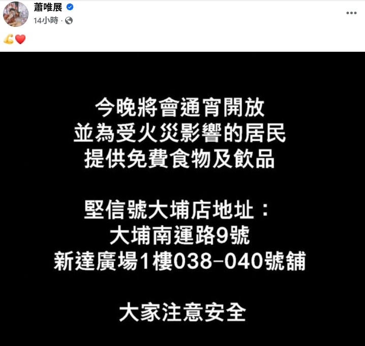 蕭唯展同太太江若琳,亦宣布旗下飲食集團嘅大埔分店通宵開門,為受影響人士免費提供食品飲品。傅明憲顧及火災中受影響嘅毛孩,表示若果有任何動物需要協助,可以聯絡愛協24小時動物拯救熱線。另外亦提供火災中獲救嘅貓貓資料,期待主人早日與貓貓重聚。