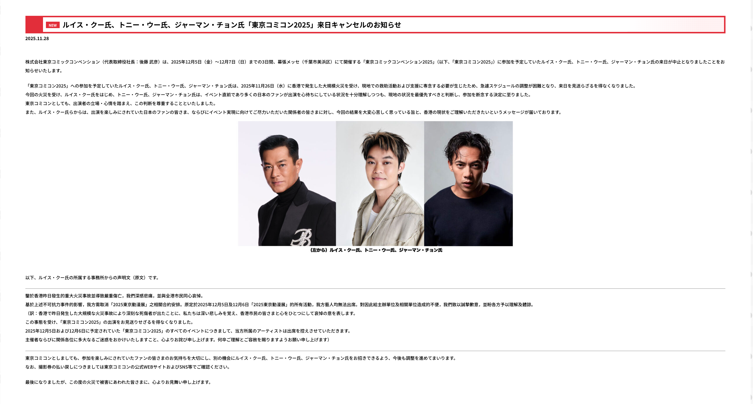 三人於28號穿上黑衣拍片宣布將取消行程缺席東京動漫節,古天樂一臉肅穆表示:「由於香港大埔發生嚴重嘅火災,造成重大嘅傷亡。全港市民包括我哋深感悲痛,喺呢個沉重嘅時刻,我哋實在冇辦法抱住正常嘅心態出席今次嘅活動,所以我哋將不會參與12月5號,同埋6號喺Comic Con嘅活動。希望原本計劃出席活動嘅朋友,以及受影響嘅相關單位能夠體諒,我哋深感歉意。最後希望逝者安息,傷者早日康復。」![]()