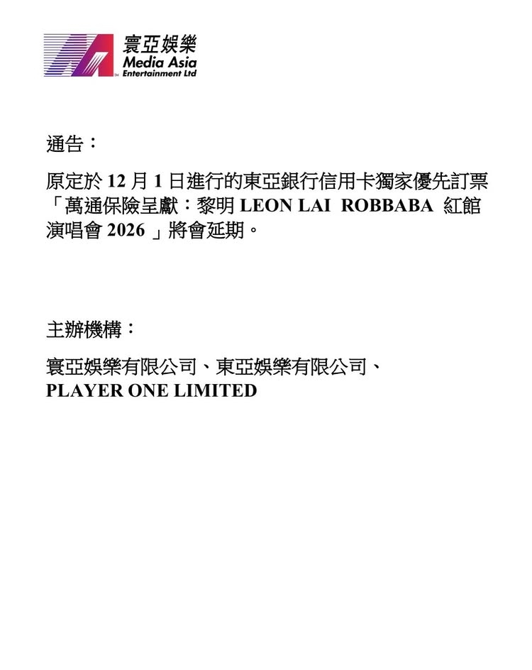 主辦機構宣佈,黎明來年3月於紅館舉行嘅演唱會,原定12月1日開始嘅信用卡優先訂票,將延期開始。