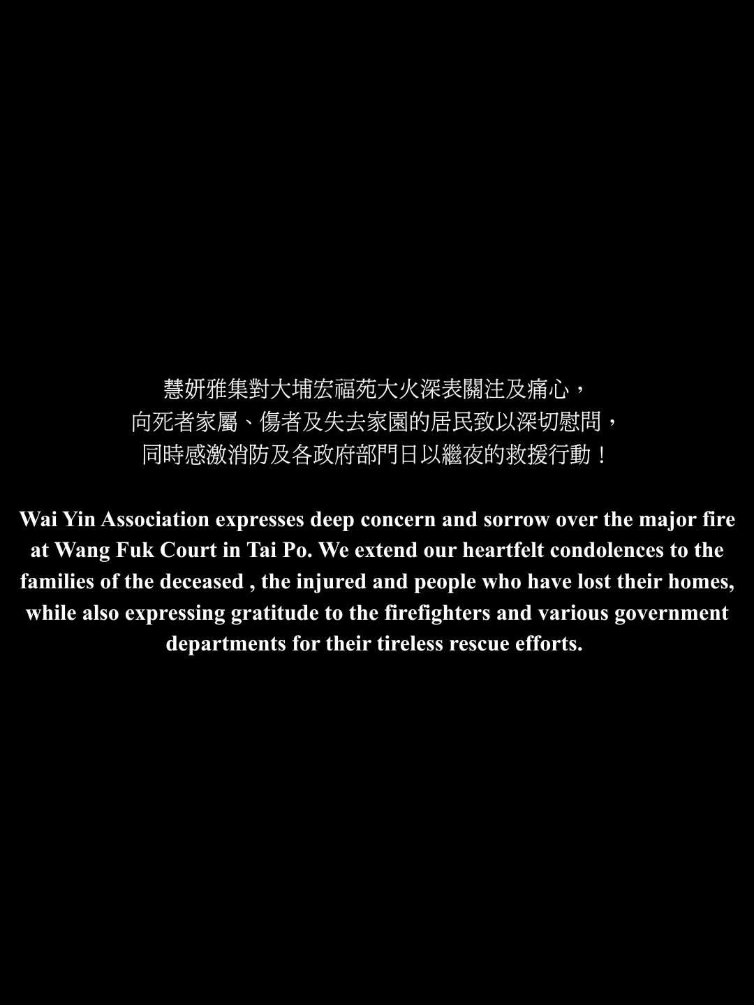 大埔宏福苑火災全城關注,慧妍雅集亦一直密切關注火災事故,截至3號為止,慧妍雅集共籌得1,211,533 元善款,稍後將陸續分批捐出,並對受火災影響嘅居民及救援團體深表關懷,亦向所有受影響人士致以最深切慰問。同時,衷心感謝連日嚟消防及各政府部門嘅救援工作。![]()