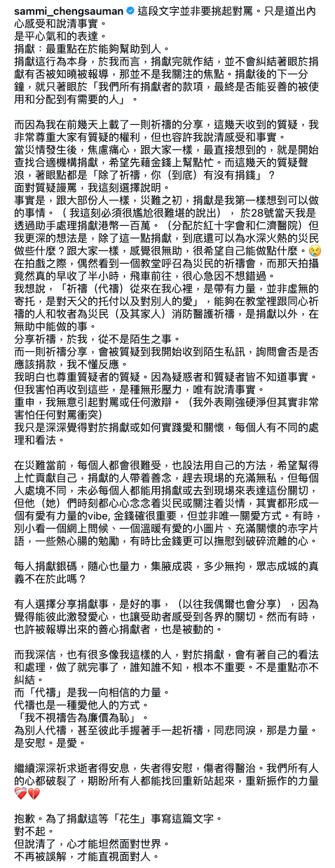 Sammi面對被質疑聲音,罕有喺社交平台發長文,佢先表示這段文字並非要挑起對罵,只係道出內心感受同說清事實,係平心氣和嘅表達。佢認為「捐獻:最重點在於能夠幫助到人。捐獻這行為本身,於我而言,捐獻完就作結,並不會糾結著眼於捐獻有否被知曉被報導,那並不是我關注的焦點。捐獻後的下一分鐘,就只著眼於『我們所有捐獻者的款項,最終是否能妥善的被使用和分配到有需要的人』」。