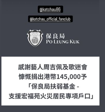 吉吉九歲時曾親身經歷茶果嶺大火,家園慘遭摧毀嘅痛苦記憶刻骨銘心,深感痛心與共情,佢與歌迷會略盡綿力合共捐出六位數字金錢到認可嘅募捐平台,用於支援大埔宏福苑嘅災民與家屬。