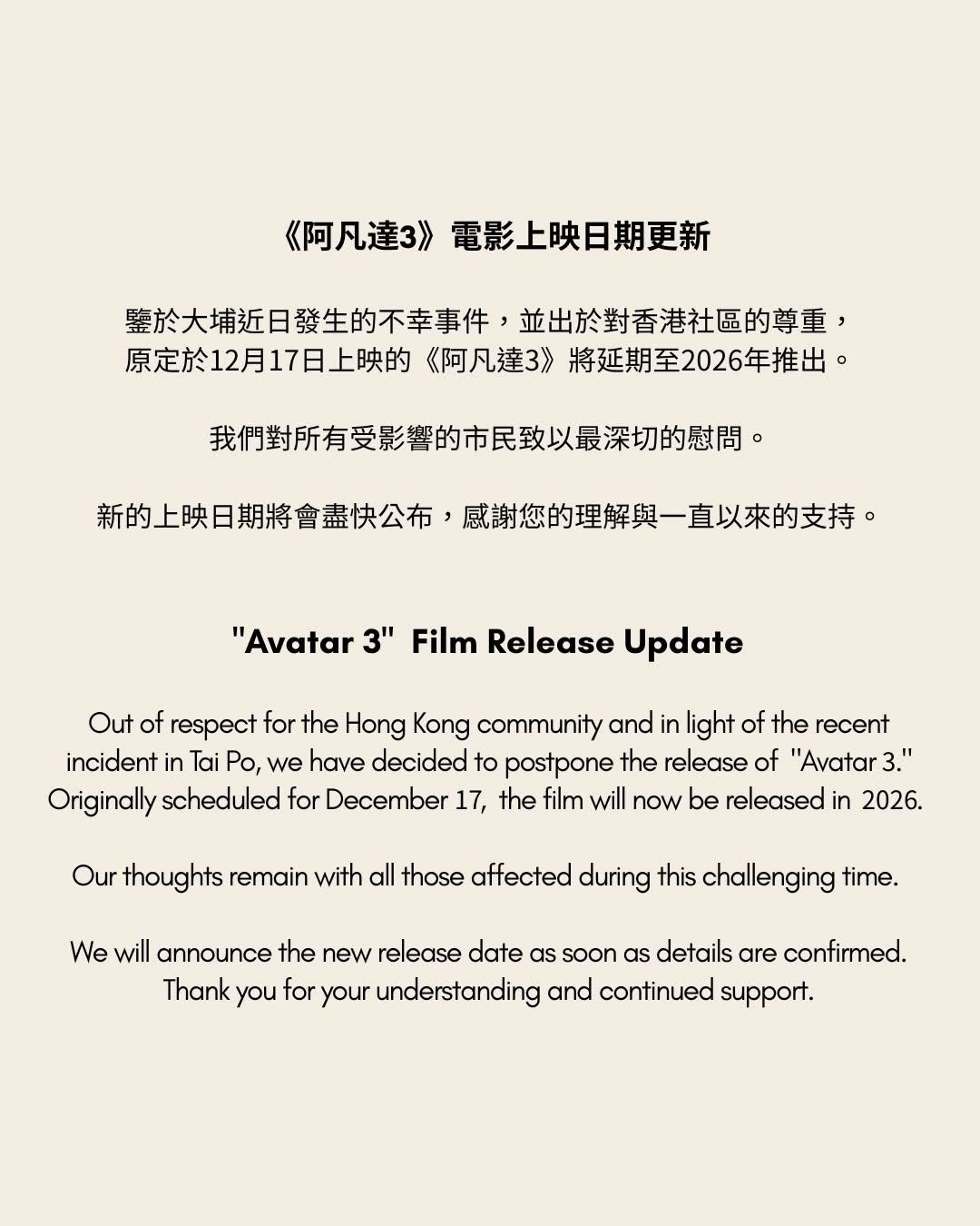 電影公司喺官方網站發出公告,鑒於大埔近日發生的不幸事件,並出於對香港社區的尊重,原定於12月17日上映的《阿凡達3》將延期至2026年推出,對所有受影響嘅市民致以最深切慰問。