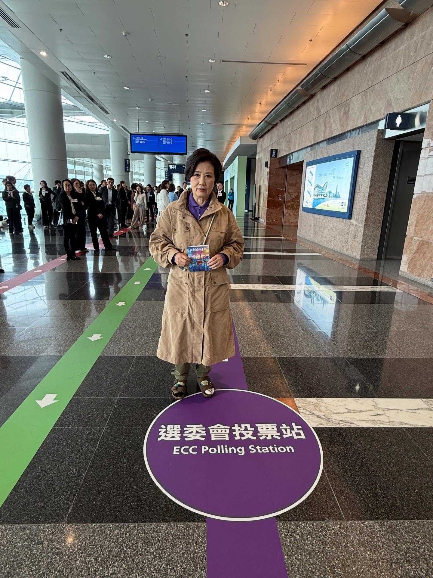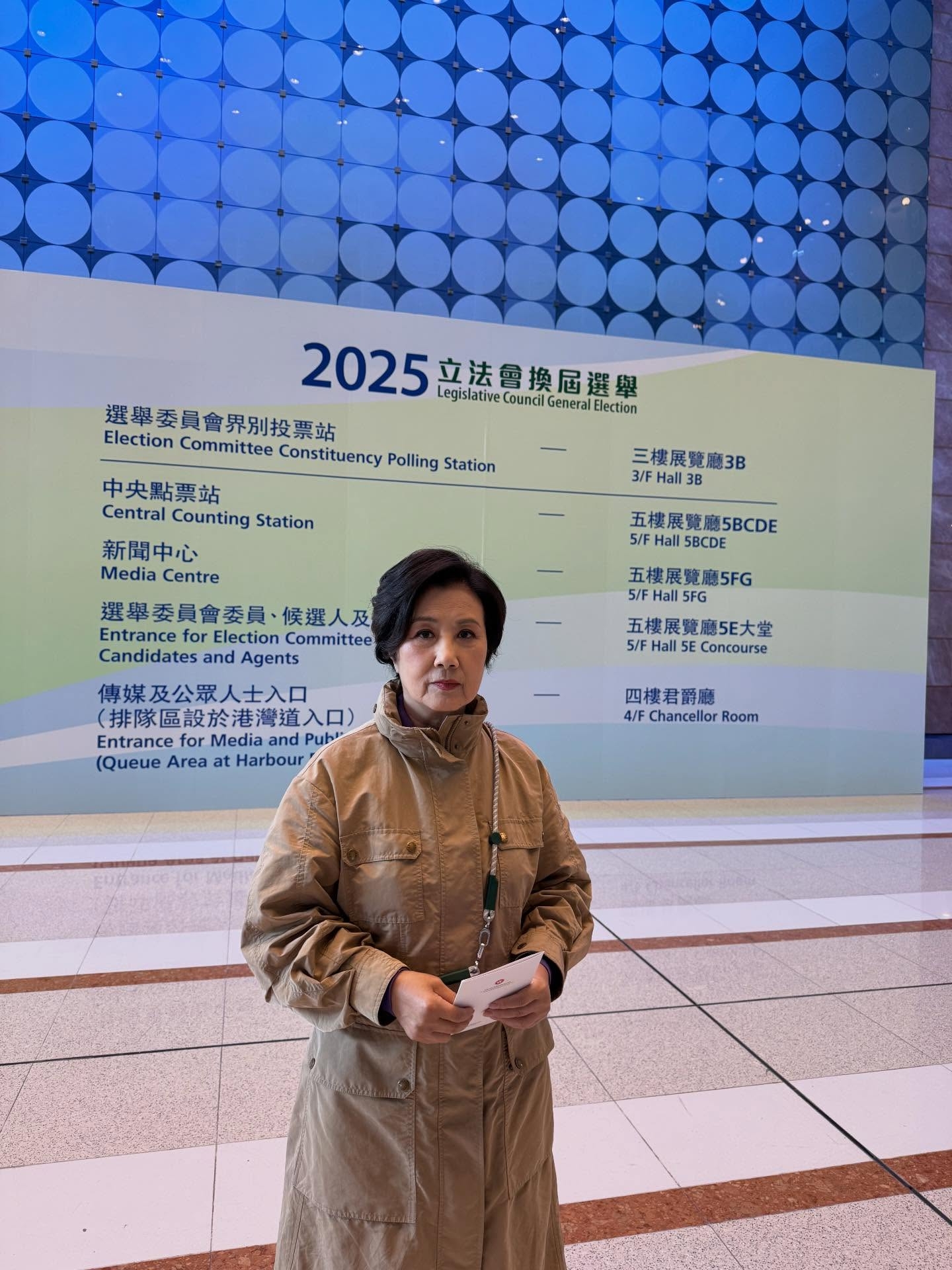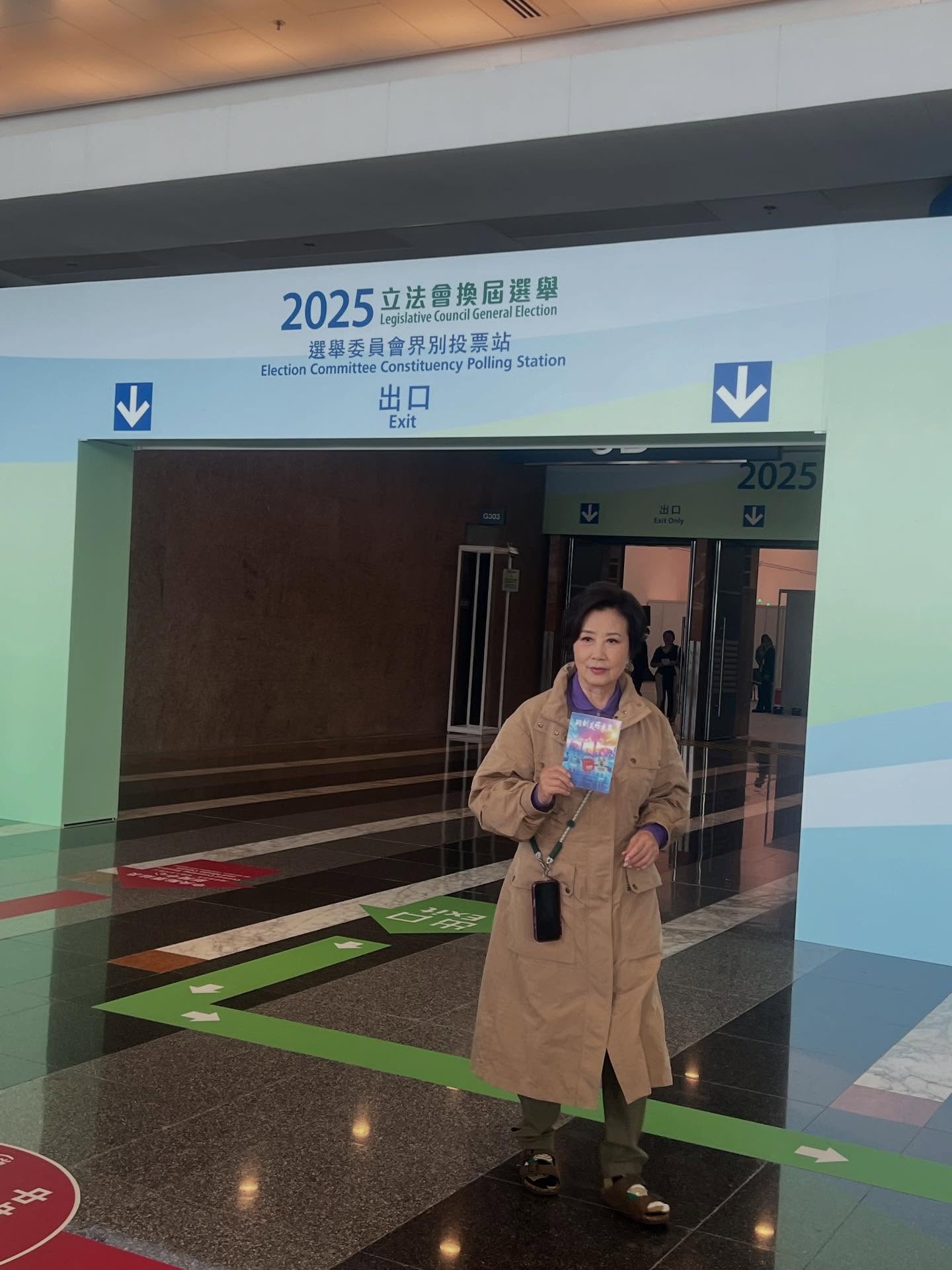 身穿卡奇色長褸嘅阿姐,投票之後,手持獲派嘅感謝卡嘅票站外打卡留念,並呼籲選民同佢一樣,記得投票,選出心水嘅立法會議員,唔少網民留言都話支持阿姐。![]()