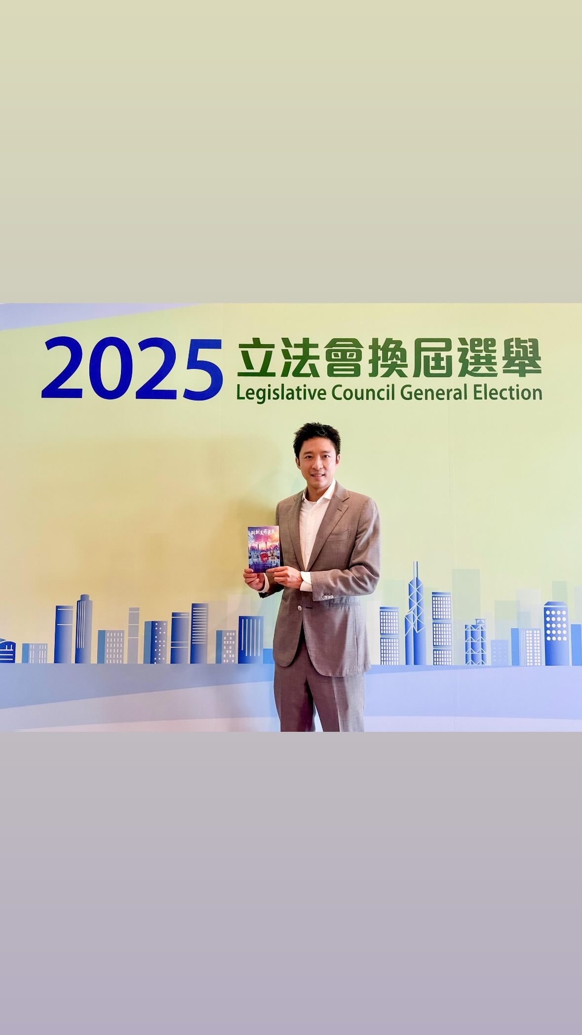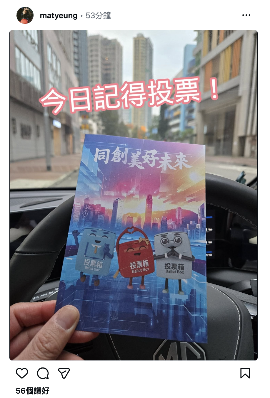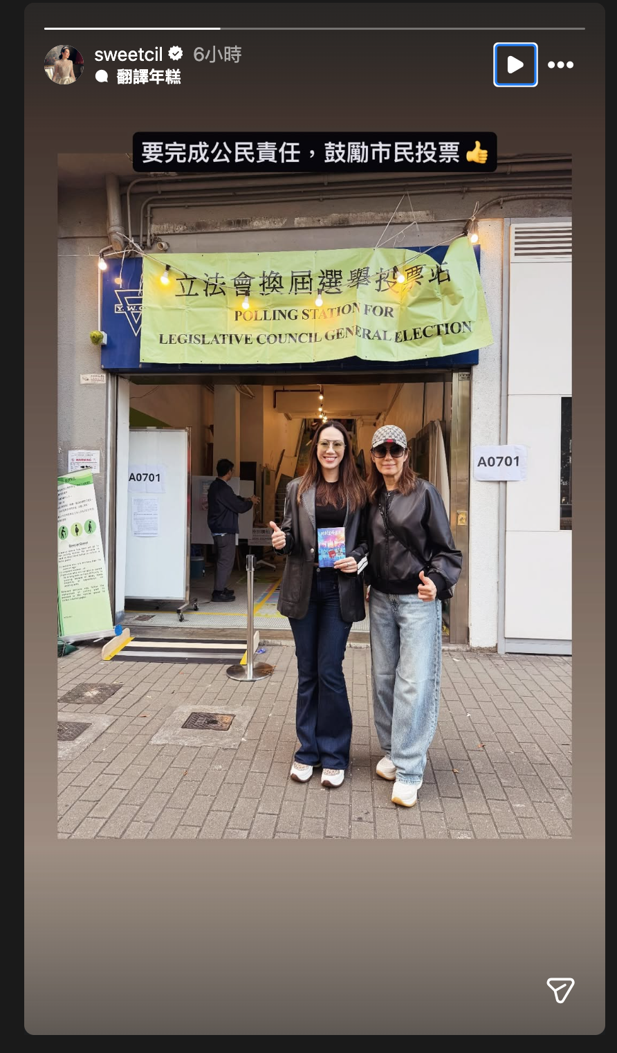 身穿卡奇色長褸嘅阿姐,投票之後,手持獲派嘅感謝卡嘅票站外打卡留念,並呼籲選民同佢一樣,記得投票,選出心水嘅立法會議員,唔少網民留言都話支持阿姐。![]()