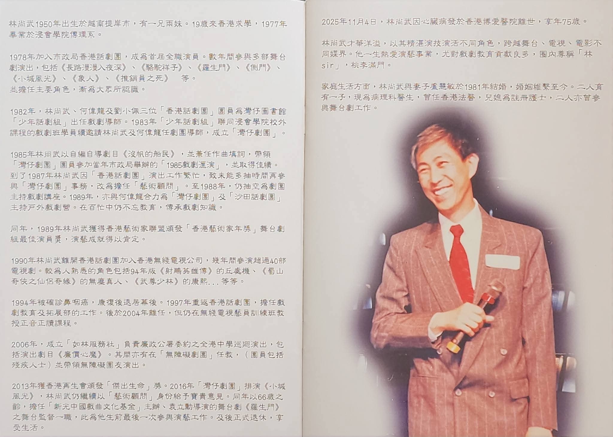 在這本紀念冊上,我一定要為林尚武先生寫一篇悼念文。不是因為他是浸會大學校友劇藝團顧問而我是該團的創會人和主席的關係。是因為他是我們未有正式行結拜儀式的大哥。