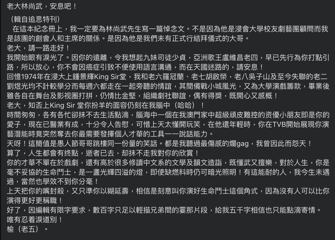 資深演員林尚武上月因病離世,終年75歲,其喪禮亦已於日前結束。林尚武嘅結拜老五徐國榆出席完喪禮後,於社交平台轉載追思特刊內嘅悼念文,緬懷自己嘅老大林尚武,更憶述老大當年因病而失去說話能力往事。![]()