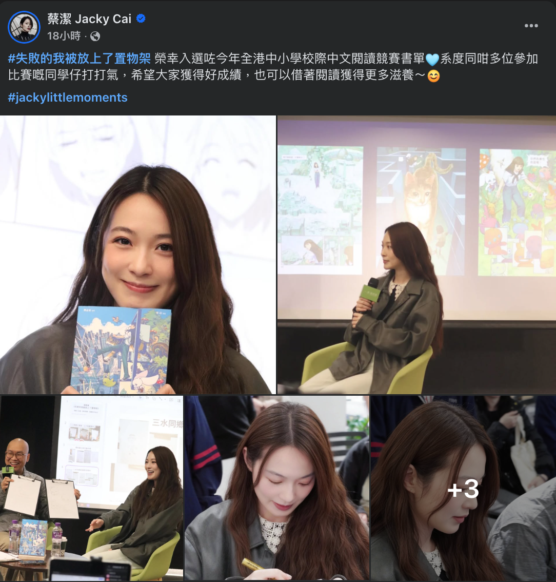 蔡潔喺社交平台開心分享消息,並為有份參與嘅多位同學仔打氣,希望大家都獲得好成績,也可以透露借著閱讀獲得更多滋養。而堅持連續三年出書嘅蔡潔,透過書中故事,帶出成敗與否因人而異,希望大家能透過作品而得到人生啟發。![]()