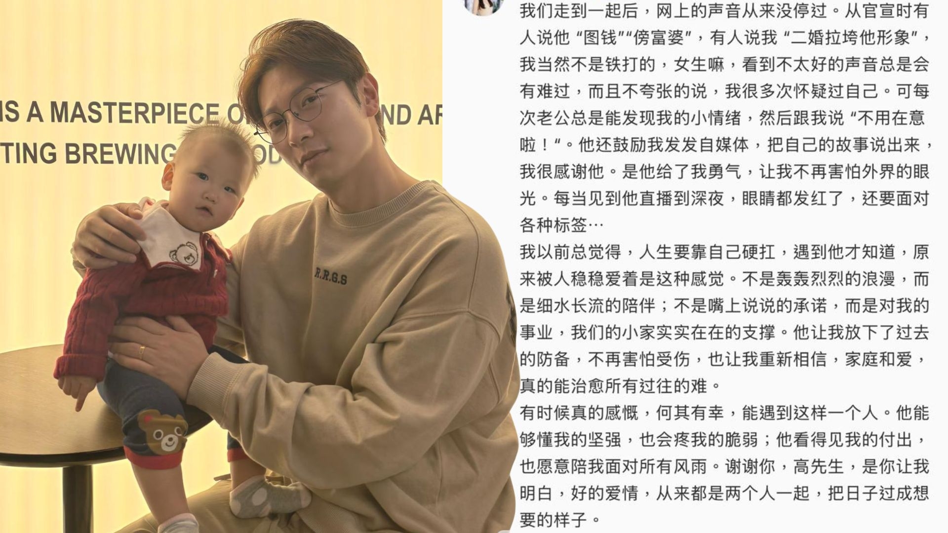 黃梓漫每當見到老公高鈞賢直播至深夜,眼睛發紅,仲要面對外界各種標籤,黃梓漫深情表示「有時候真的感慨,何其有幸,能遇到這樣一個人。他能夠懂我的堅強,也會疼我的脆弱;他看得見我的付出,也願意陪我面對所有風雨」,坦言明白好嘅愛情係靠兩人一齊「把日子過成想要的樣子」,表達對老公非常信任。![]()
