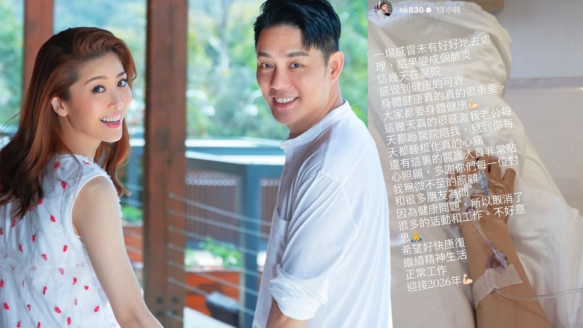 Niki透露因一場感冒未有好好去處理,結果變成肺炎,又指自己喺醫院呢幾日感覺到健康嘅可貴,身體健康好重要,同時感激老公每日喺醫院陪伴,「見到你每天都睡梳化真的心痛,還有這裏的醫護人員非常貼心照顧」。