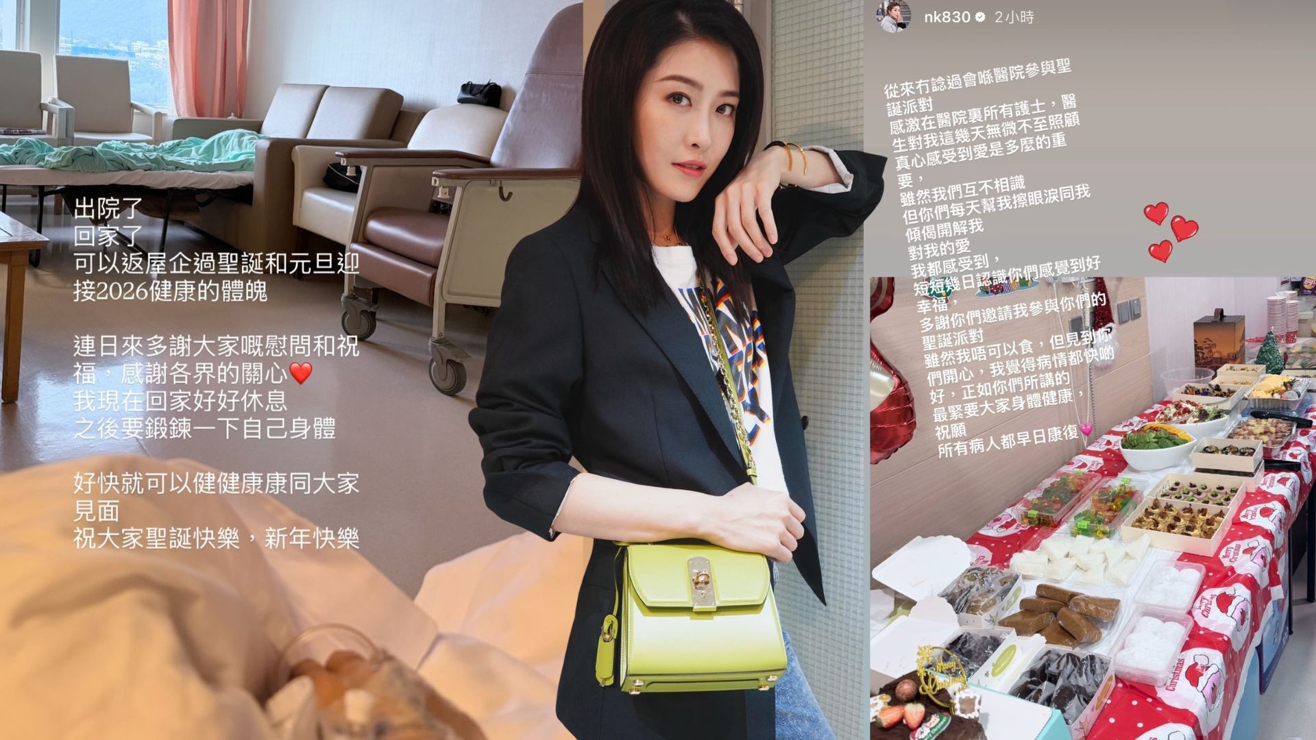 Niki今次參加咗醫院嘅聖誕派對,感激醫護呢幾日無微不至,並寫道:「雖然我們互不相識,但你們每天幫我擦眼淚同我傾偈開解我……短短幾日認識你們感覺到好幸福,多謝你們邀請我參與你們的聖誕派對,雖然我唔可以食,但見到你們開心,我覺得病情都快啲好。」Niki噚日終於出院,返屋企好好休息,與家人歡度聖誕及元旦,迎接2026健康嘅體魄。
