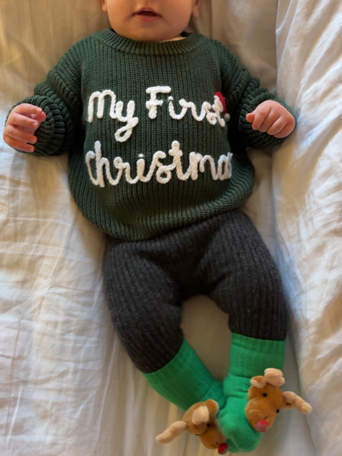 而謝婷婷(Jennifer )今年7月誕下兒子Brooklyn Milne,今年佢為仔女準備咗聖誕禮物,又一齊行聖誕市集,而阿仔Brooklyn亦著上「My First Christmas」嘅綠色冷衫,配上聖誕鹿襪仔,佳節儀式感拉滿,佢喺IG帖文「Wishing everyone a cozy, merry Christmas🎄♥️」。