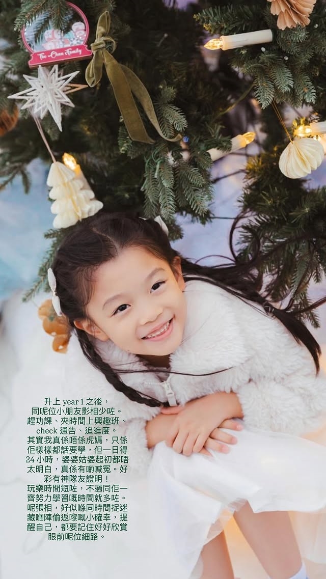 陳展鵬與太太單文柔婚後誕下女兒「小豬比」陳諾瑤(Quinta),單文柔就主力相夫教子,不時為老公展鵬及愛女小豬比製造驚喜,單文柔近日喺社交平台分享一家三口出海拍攝嘅聖誕全家福,面對阿女升Year 1後,玩樂時間短咗,單文柔坦言唔係虎媽,但係小豬比樣樣都話要學,令時間表排得好滿!