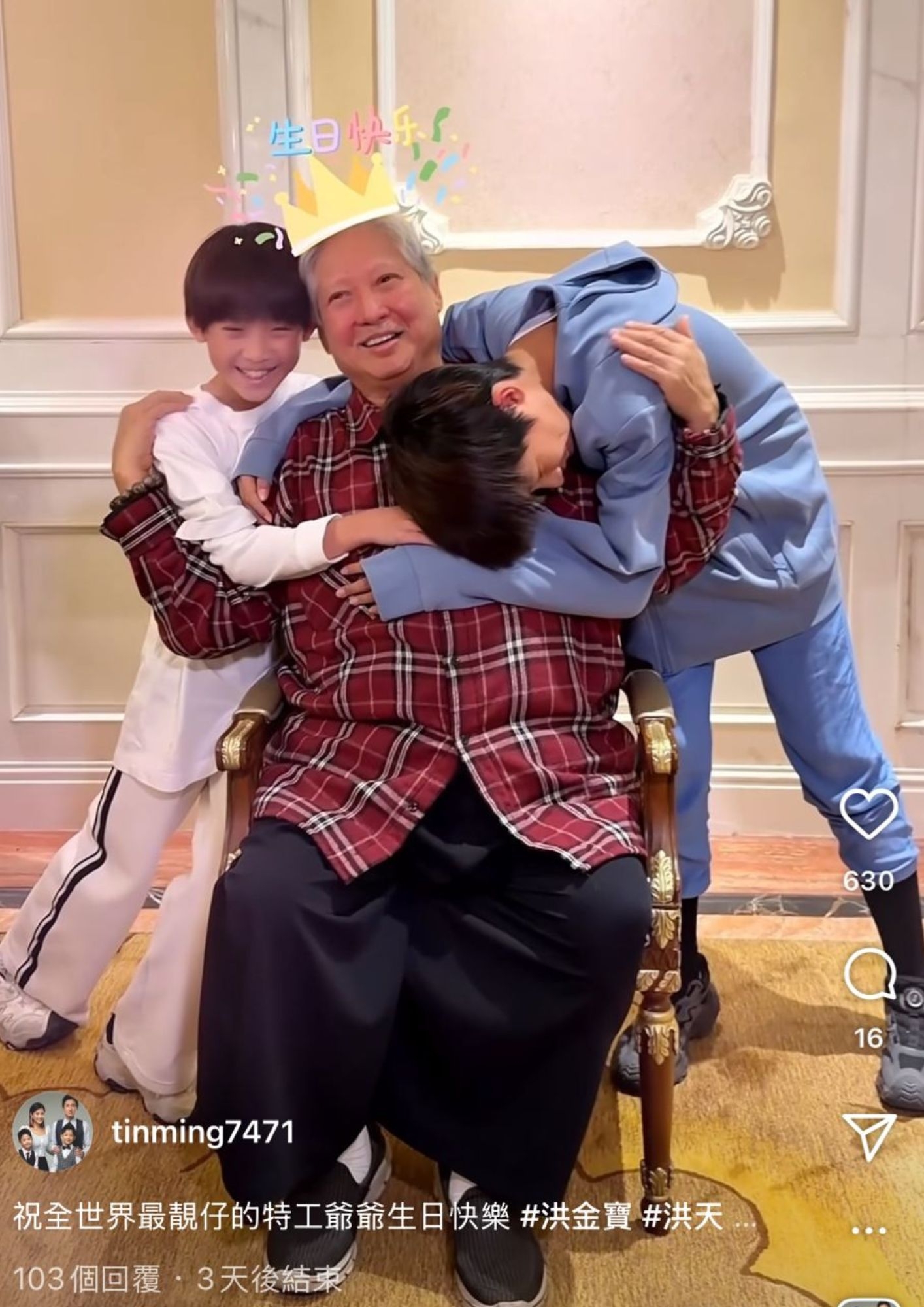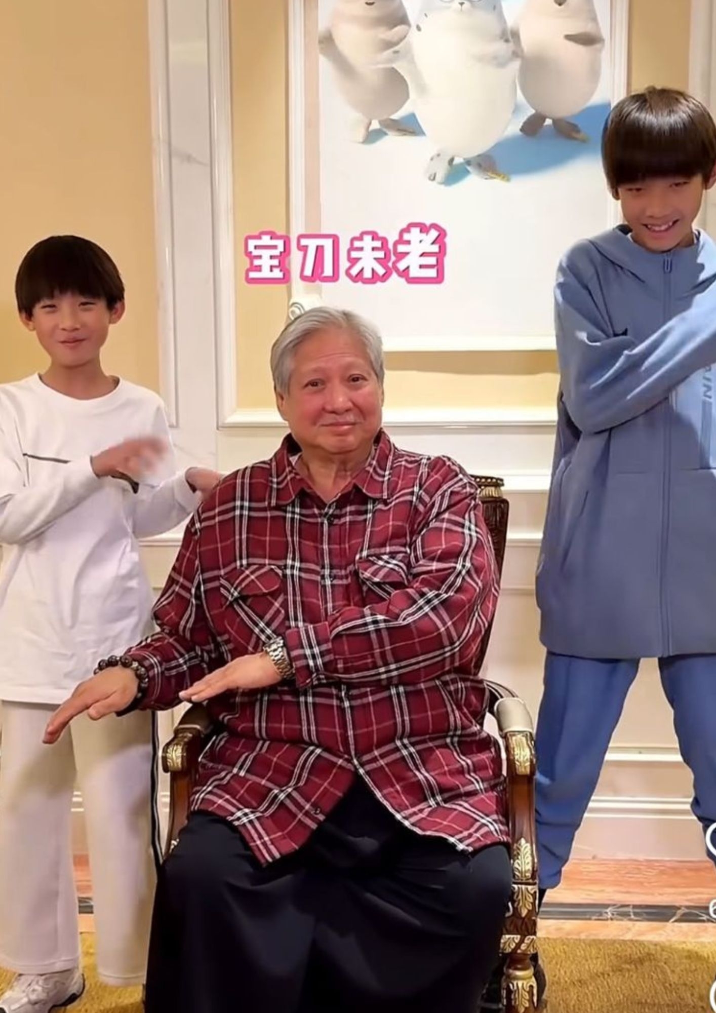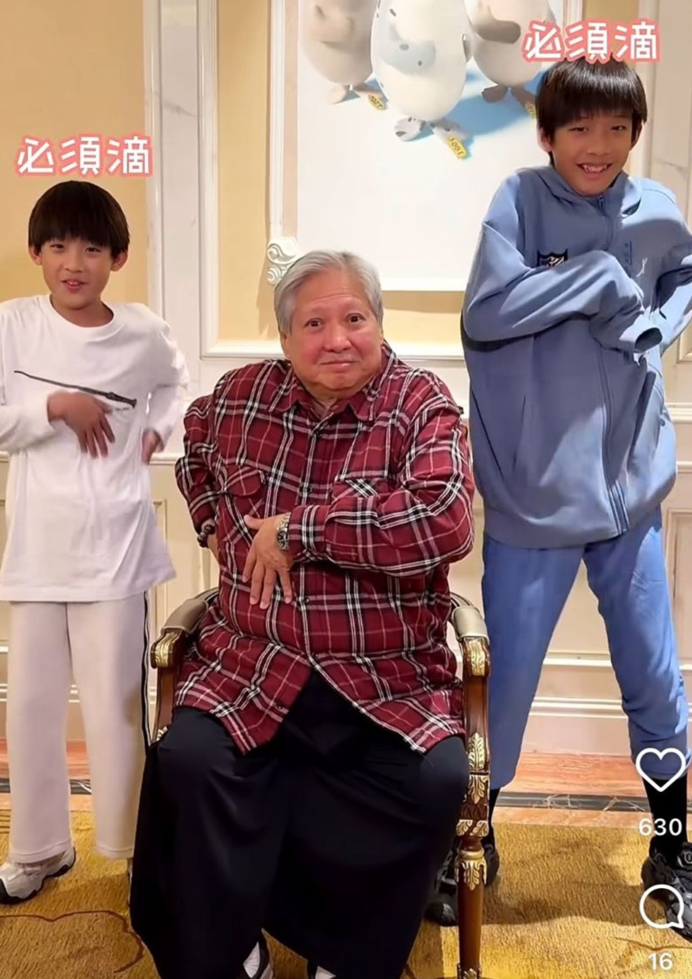 「大哥大」洪金寶迎嚟74歲生日,兒子洪天明不時為阿爸安排生日驚喜,佢喺社交平台上載一條洪金寶跳舞影片,見洪金寶同兩個乖孫齊齊跳內地網流行嘅「海豹舞」,無論係姿態同表情,洪金寶都跳得好投入!