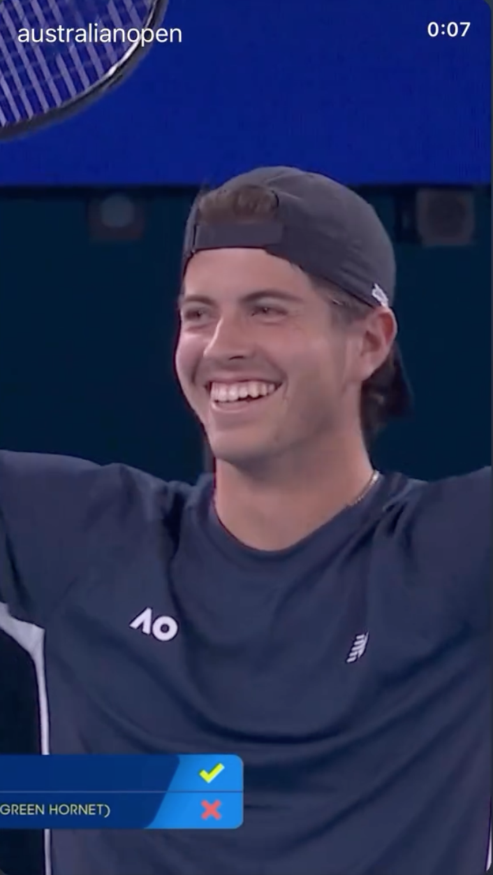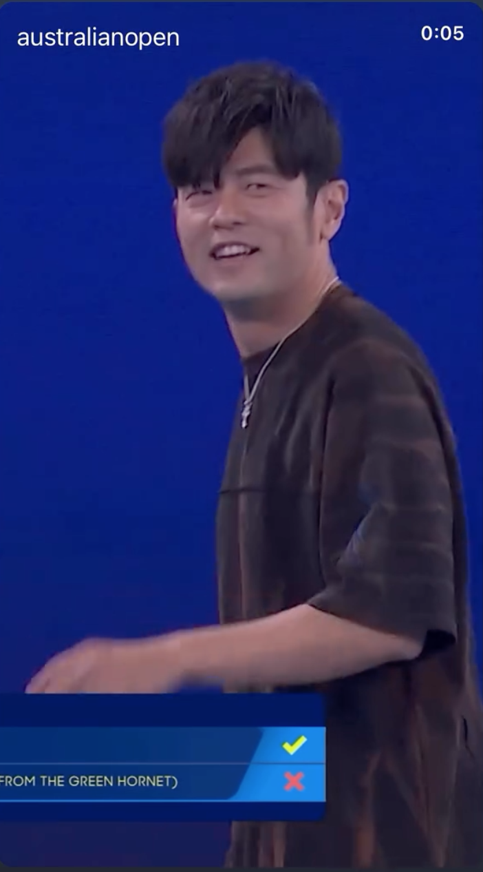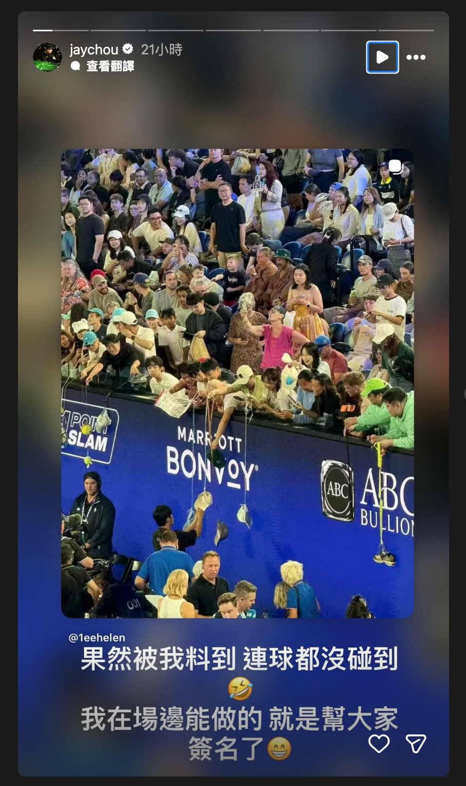 近年愛上打網球嘅周杰倫,不時會相約好友一齊打波。14號周董就以球員身份,參加澳洲網球公開賽表演型賽事「One Point Slam(一球制勝)」,不過對上澳洲職業陪練員Petar Jovic嘅周董,連球都冇掂到就已經輸咗賽事,賽後周董都喺社交平台自嘲:「果然被我料到 連球都沒碰到🤣我在場邊能做的 就是幫大家簽名了😁」並附上自己於球場邊為球迷簽名嘅照片。![]()