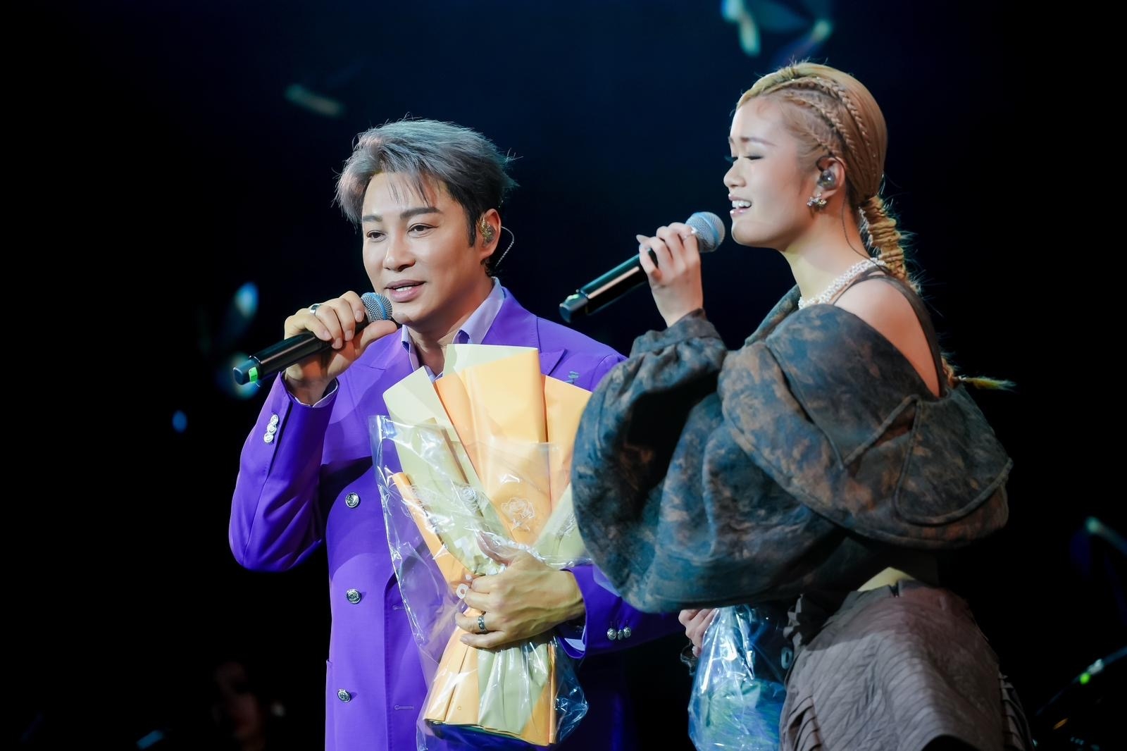 早前阿譚以導師身份同《聲秀》多位學員結緣,今次廣州個唱亦邀請學員 布子殷 參與演出。初踏內地舞台嘅布子獨唱《風的形狀》,之後更同阿譚攜手演繹《春夏秋冬》,兩代歌者聲音交織融合,布子喺台上感謝作為恩師阿譚俾佢好多機會。