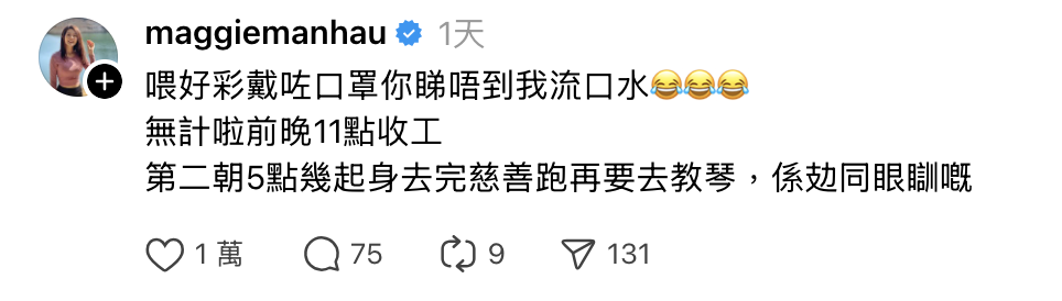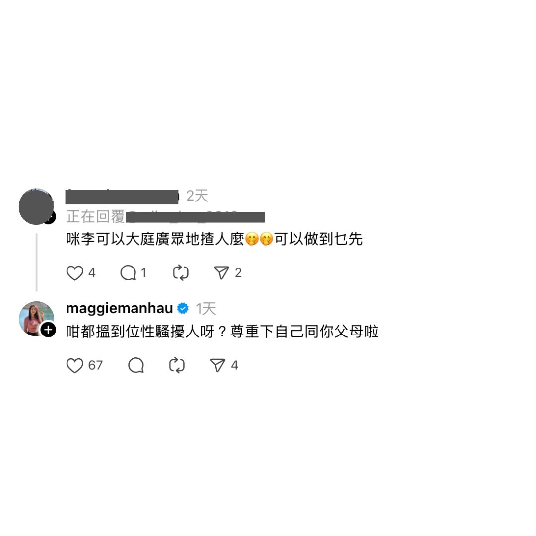 Maggie更笑言,好彩戴咗口罩,先冇被人睇到自己瞓到流口水。親切嘅Maggie仲喺該Post下面回覆咗唔少留言,不過面對有人作出涉及性騷擾嘅留言:「可以大庭廣眾地揸人麼?可以做到乜先」,Maggie就立即重語氣回覆,向對方正面出撃︰「咁都搵到位性騷擾人呀?尊重下自己同你父母啦!」