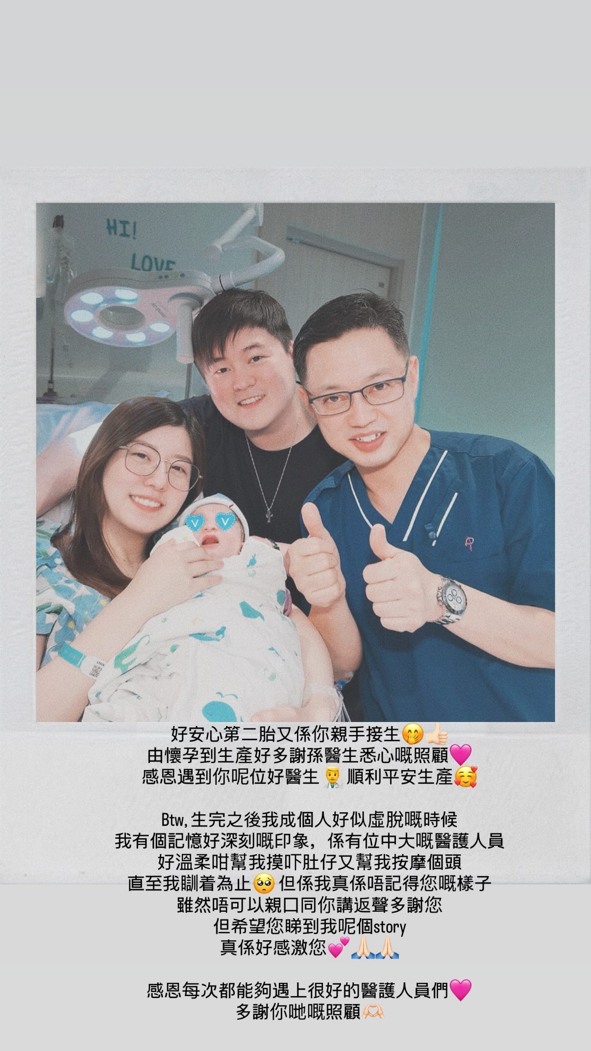 再次做媽咪嘅Erica公開同老公、BB仲有醫生嘅合照,又寫道非常感謝醫護人員細心又體貼嘅照顧同按摩咁話。![]()