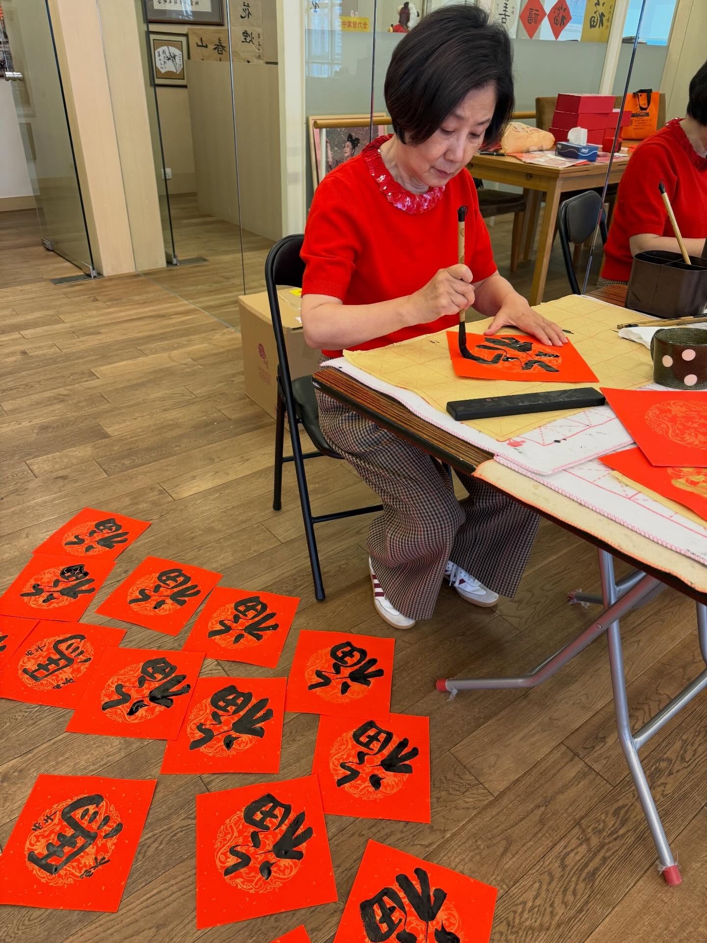 阿姐近日就喺社交平台分享贈送蘿蔔糕同寫揮春嘅照片,相中所見,譚俊彥、梅小惠同周奕瑋等後輩,先後到阿姐工作室拎蘿蔔糕,以及阿姐親自揮毫嘅墨寶,而另一張相中,阿姐親筆寫嘅「福」字同「馬」字揮春,更多到要放於地上風乾墨水。![]()