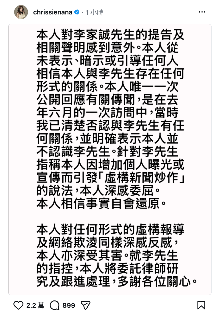 對於李家誠嘅指控,周秀娜於13號晚上亦於社交平台作出回應,佢直言對李家誠嘅提告及相關聲明感到意外:「本人從未表示、暗示或引導任何人相信本人與李先生存在任何形式的關係。本人唯一一次公開回應有關傳聞,是在去年六月的一次訪問中,當時我已清楚否認與李先生有任何關係,並明確表示本人並不認識李先生。針對李先生指稱本人因增加個人曝光或宣傳而引發『虛構新聞炒作』的說法,本人深感委屈。本人相信事實自會還原。」![]()