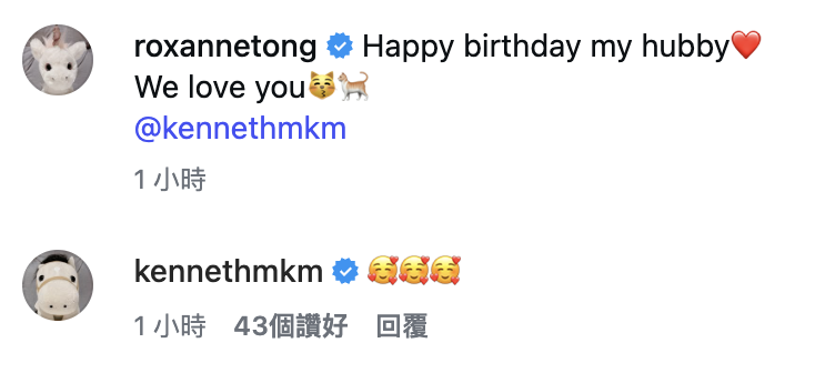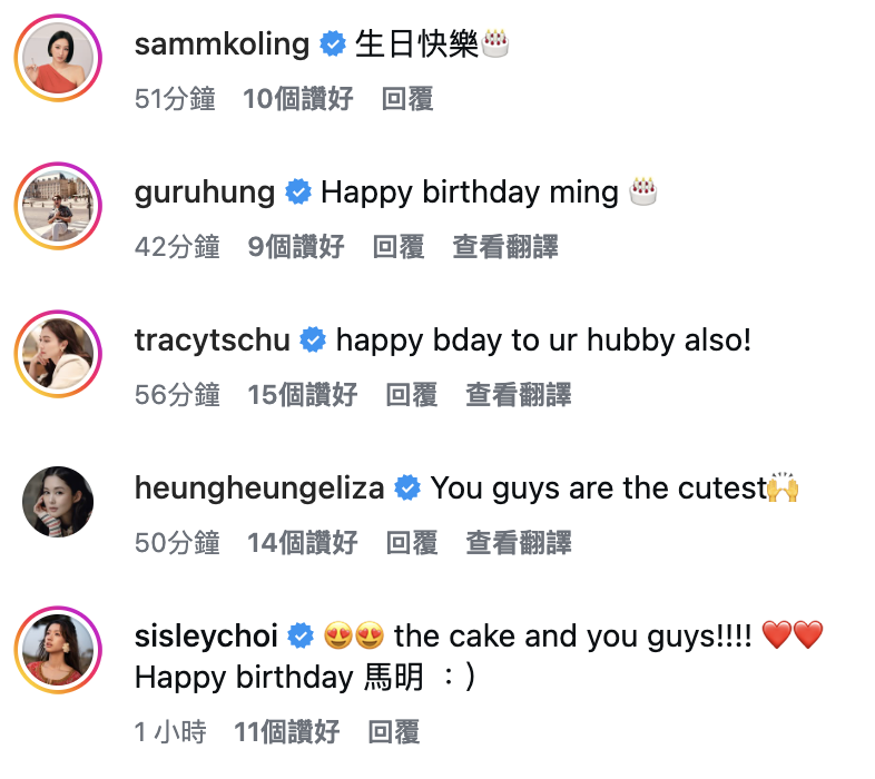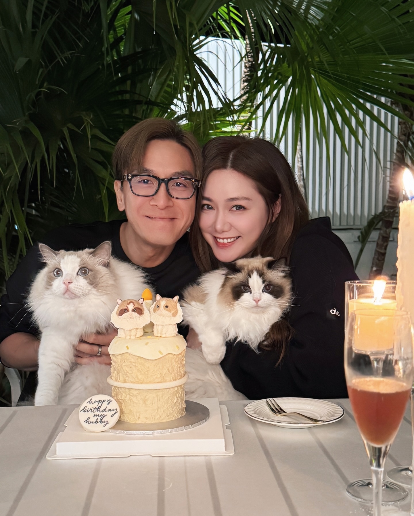 另一張就可以見到戴住眼鏡嘅壽星同老婆碰杯慶祝,馬明放鬆之下自然就有招牌天然呆表情出現,非常可愛。靚湯嘅post又寫道:Happy birthday my hubby❤️We love you😽🐈。而一眾好友包括 高海寧 洪永城 朱千雪 岑麗香 蔡思貝 岑杏賢 蔣家旻 等亦齊齊向馬明送上生日祝福。