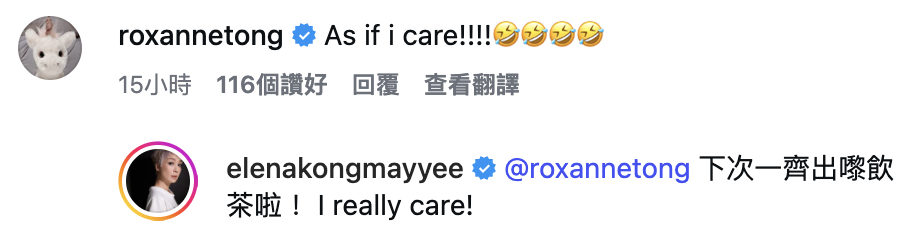 可惜二太太 陳玉蓮 未有現身,有網友亦因覺可惜而問美儀姐,佢就非常入戲咁答話:佢同齊日輝(黃智賢)喺英國,令大家再次跌入劇情當中,唔少網友見到呢個回應都獨狂俾like。馬明太太靚湯亦都以美儀姐爆紅英文對白As if i care!!!!留言,佢亦回應要呢個正牌新抱下次要一次出現同鍾家上下飲茶呀。