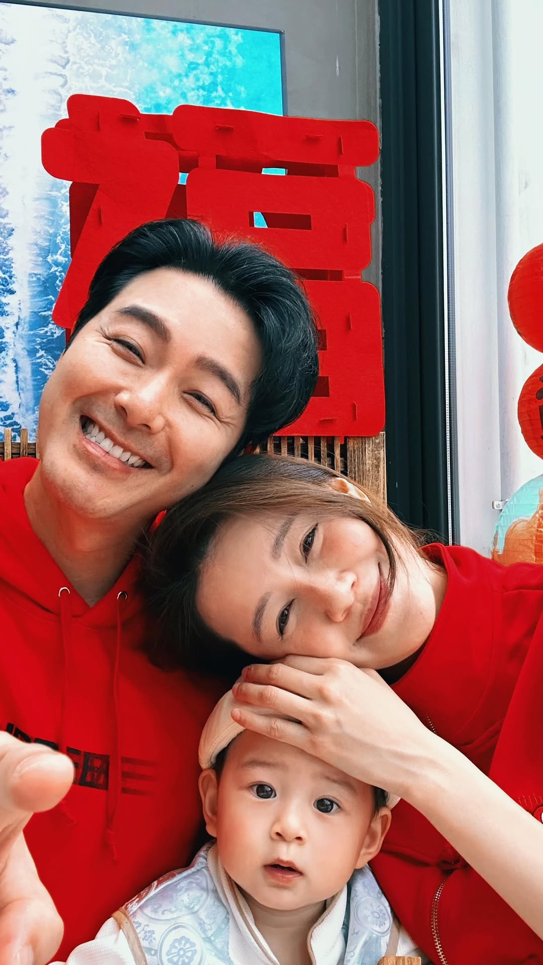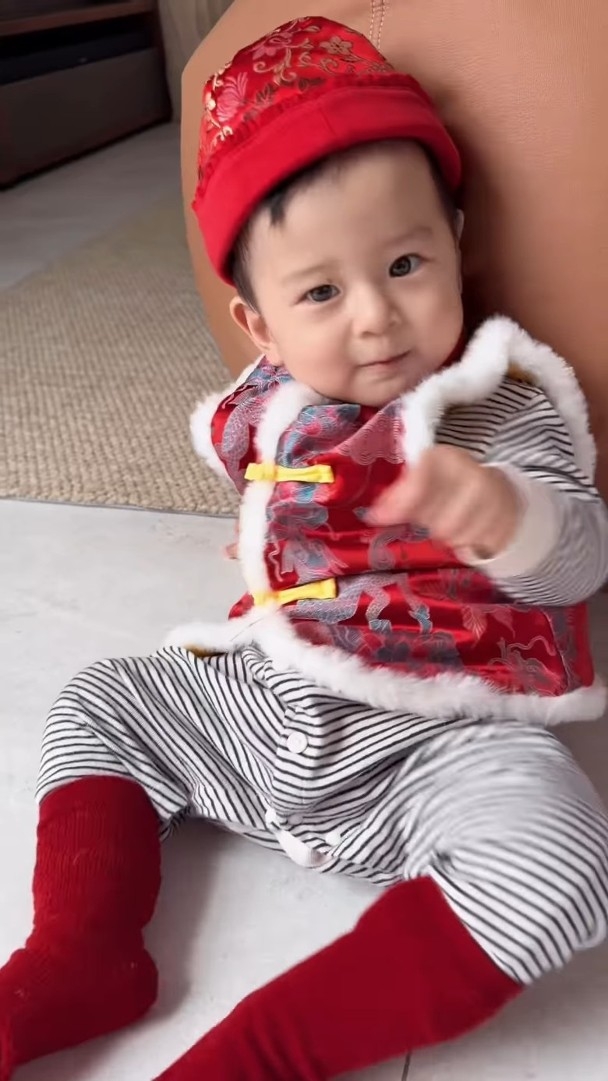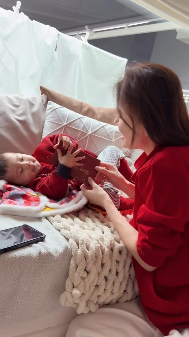 翠如喺社交平台貼出身穿紅噹噹嘅喜慶新衫,同兒子「哈哈」玩,阿蕭向半躺嘅「哈哈」派利是笑稱:「愛媽媽,同爸爸係最好嘅朋友。」翠如就話:「畀兩封利是你,可以即刻躺平。」兩公婆照顧「哈哈」更係一臉慈愛,翠如留言向大家送上祝福:「來到初三先同大家拜年🥰祝幸福快樂健康,平安,慢高長大❤️。」