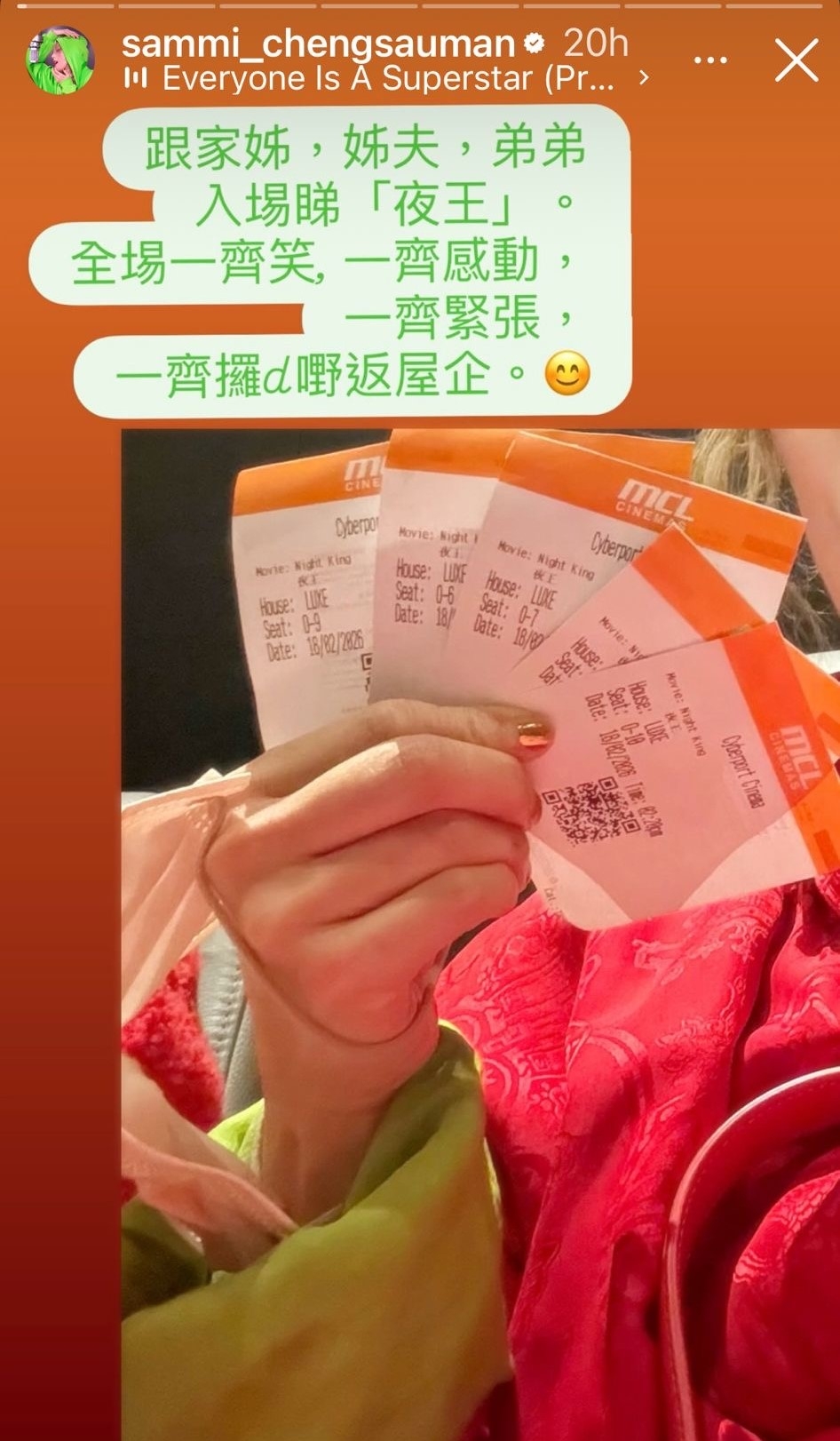 年初五東日團隊繼續四出謝票,感謝大家支持,導演吳煒倫表示:「好開心觀眾喜歡《夜王》。近日已經在網上見到好多觀眾寫低對部戲嘅評價同埋讚賞,真的感激不盡。希望大家睇得開心,再帶走一份勇氣同精神,馬年繼續為自己人生打拼,殺返上去!」 Sammi過年前馬不停蹄完成一連串宣傳後,趁新年假期跟家姐、姊夫、弟弟一齊入場,笑住迎馬!Sammi並稱:「由開拍到前陣子瘋狂式緊密宣傳工作,一切一切記憶猶在。一步一腳印。點滴在心頭。歡哥V姐跟東日的仝人(包括太子峰)衷心多謝每一位的入埸。這部電影是我們的共同結晶品。才公映兩天,路仍漫長,繼續一步一腳印。」