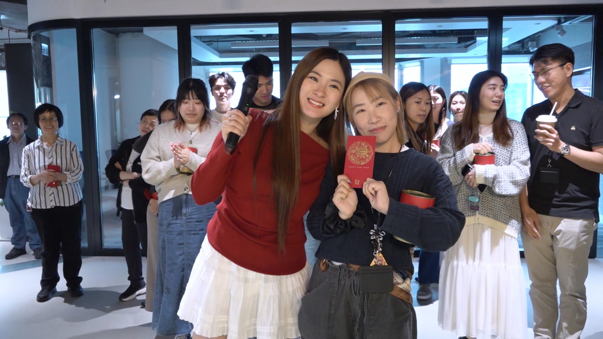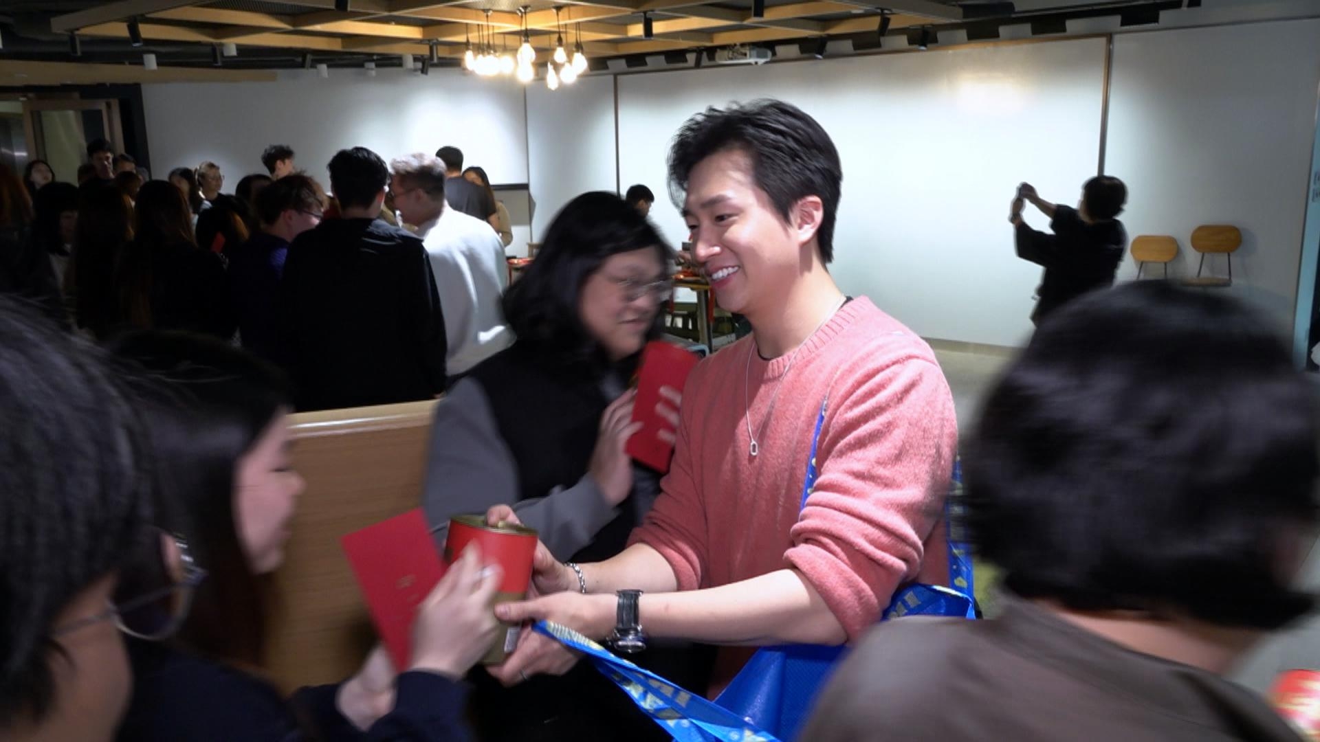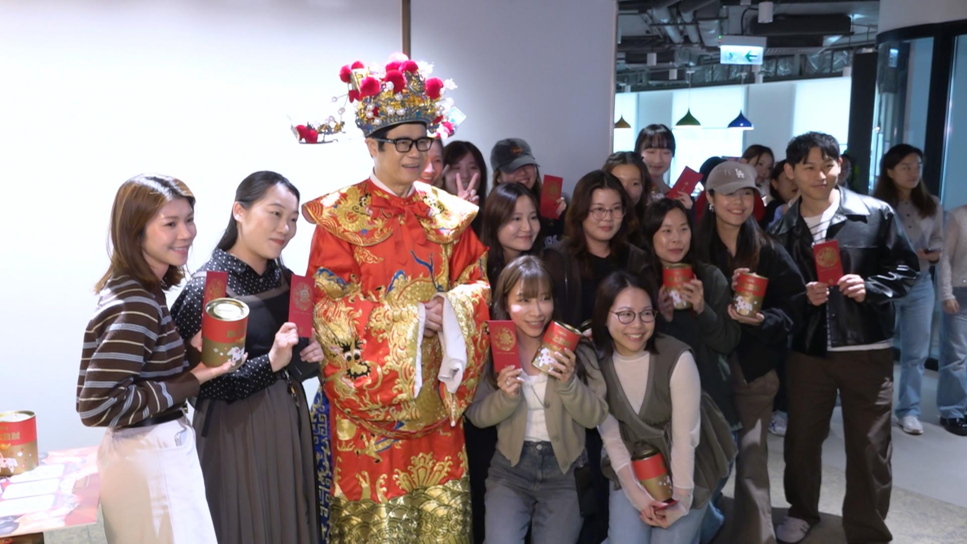 大王一身財神打扮成為最受歡迎吉祥物,眾多人排隊搵佢集郵,但大王就好謙虛熱捧GM做接班人,大讚佢同女友Sophie好受客戶歡迎,一輪咀送上稱讚,最初GM嘗試同大王互笠高帽,最終口才不敵前輩,場面搞笑,隨後大王又率領佢哋向TVB娛樂新聞台送上祝福。![]()
