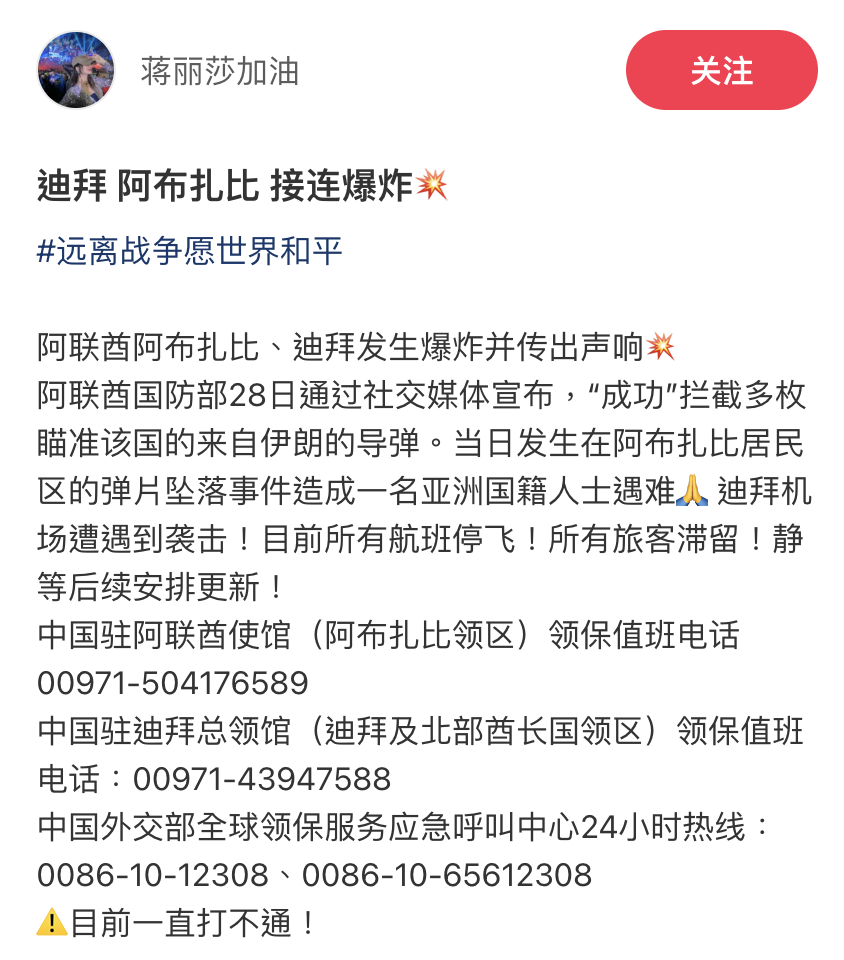 而Lisa之後亦再一次出Post,畫面似為官方發佈嘅避難警告,指示應就近於安全建築中躲避。佢亦同步於Post中貼出阿聯酋各地嘅中國使領館同外交部嘅緊急電話號碼,不過亦指出全部未能接通。![]()