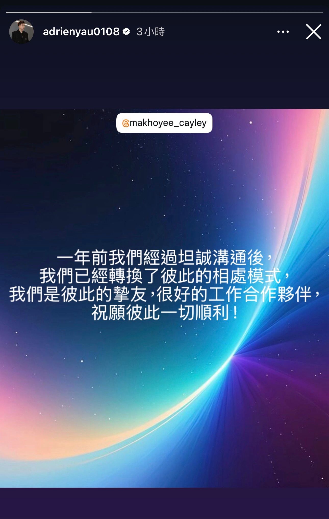 丘梓謙與麥皓兒分別喺社交平台限時動態表示:「一年前我們經過坦誠溝通後,我們已經轉換了彼此的相處模式,我們是彼此的摯友,很好的工作合作夥伴,祝願彼此一切順利!」雖然冇提及「分手」兩字,不過佢哋就將彼此關係由戀人降呢成為摯友及工作夥伴,更喺社交平台刪走昔日恩愛合照。