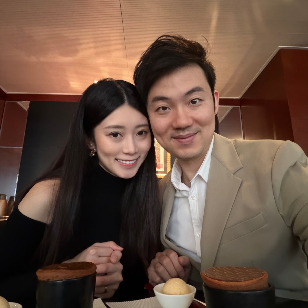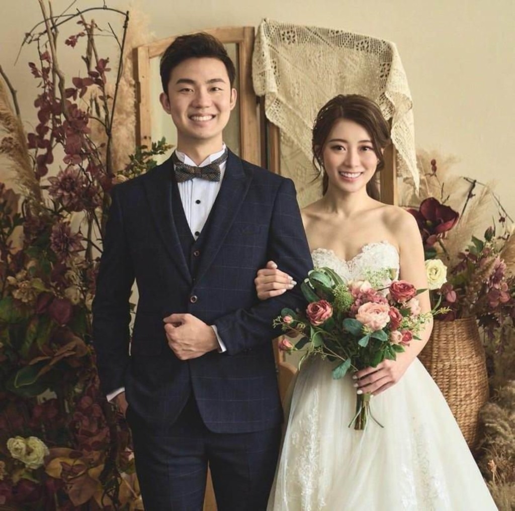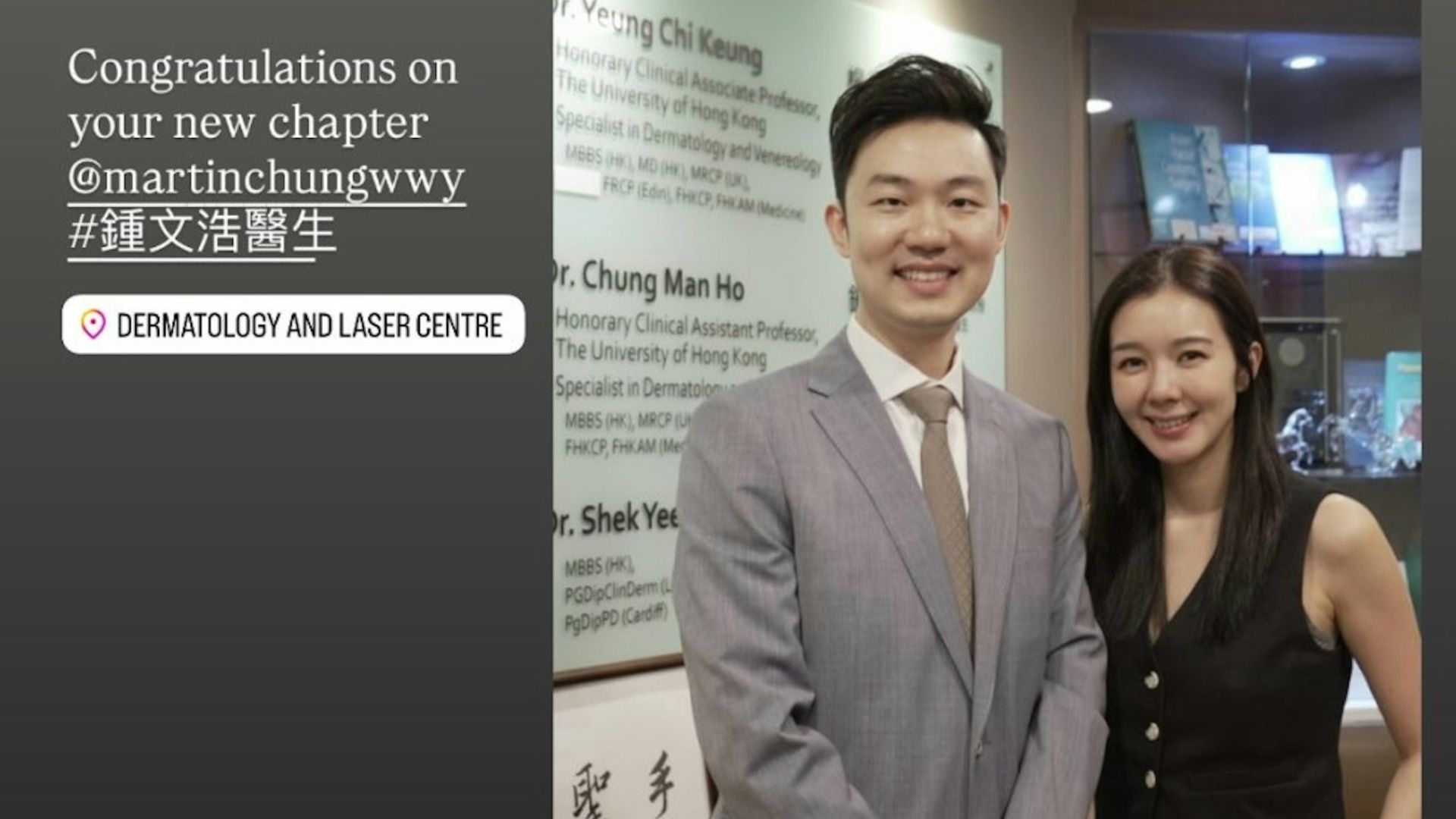 相中見黃潁妍甜蜜地挽住老公鍾文浩手臂,麥明詩祝賀:「congratulations on your new chapter!」鍾文浩於2021年迎娶曾報讀TVB第17期藝員訓練班嘅黃潁妍,過住美滿婚姻生活,鍾文浩嘅社交平台帳戶頭像亦上載夫婦撐枱腳嘅恩愛合照,可見醫學界才俊非常愛妻。