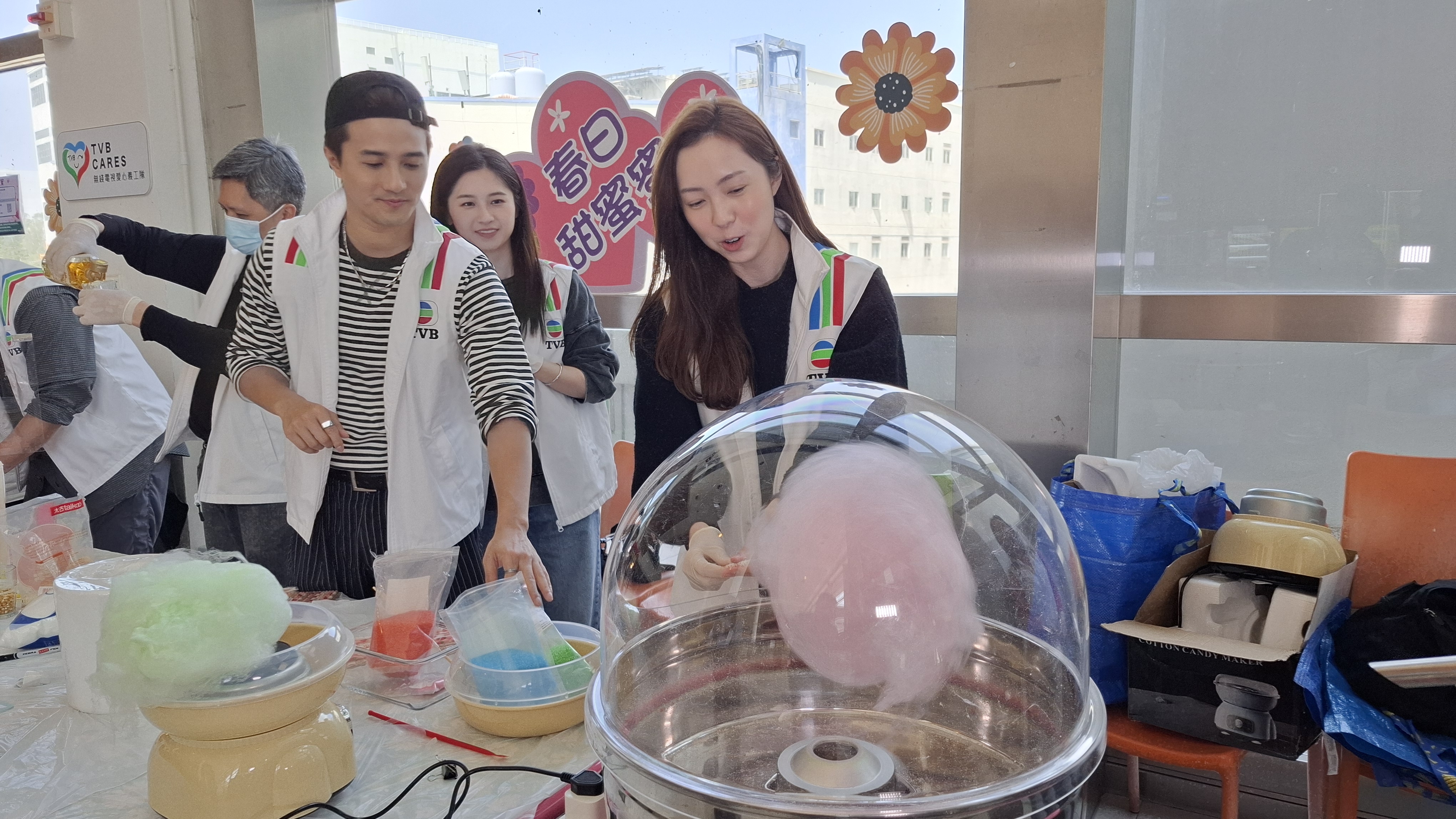 呢日TVB Canteen特別熱鬧,事關無綫電視愛心義工隊呢日舉行「春日甜蜜蜜」嘅活動,黃庭鋒、倪嘉雯仲有李海銅亦有落場一齊擺檔,佢哋仲親自炮製龍鬚糖、棉花糖、爆谷同糖葱餅呢啲懷舊小食,真係成個美食嘉年華咁熱鬧呀﹗庭鋒話自從拍完《香港原味道》時,都未再食過同整過龍鬚糖,至於Carmen就好開心,呢日可以落手去整懷舊小食,佢話係一次難得嘅體驗。![]()