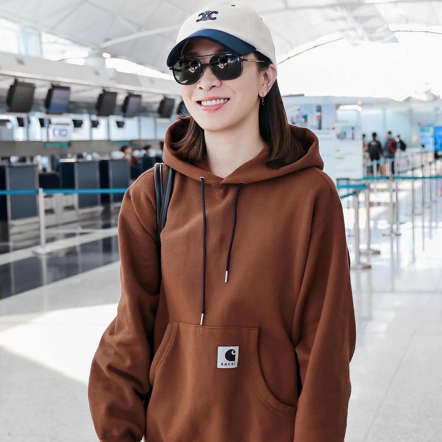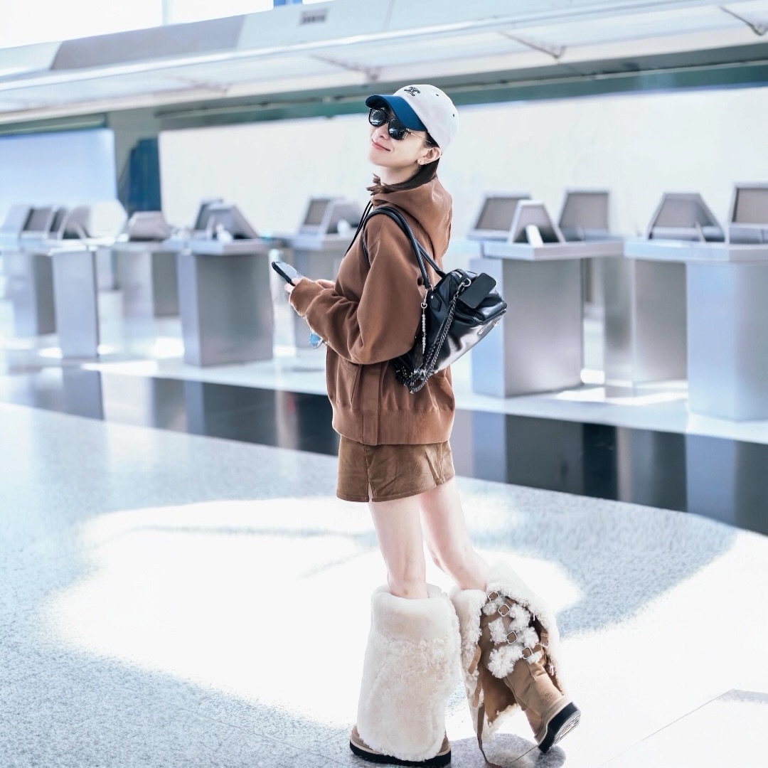 阿佘著住啡色連帽衛衣配同色短裙,好適合香港大約20度嘅氣溫,最搶眼係佢對毛毛boots,估計係要配合北京10度以下嘅低溫。阿佘頭戴cap帽加黑超,睇嚟係精心打扮過嘅機場時尚。![]()