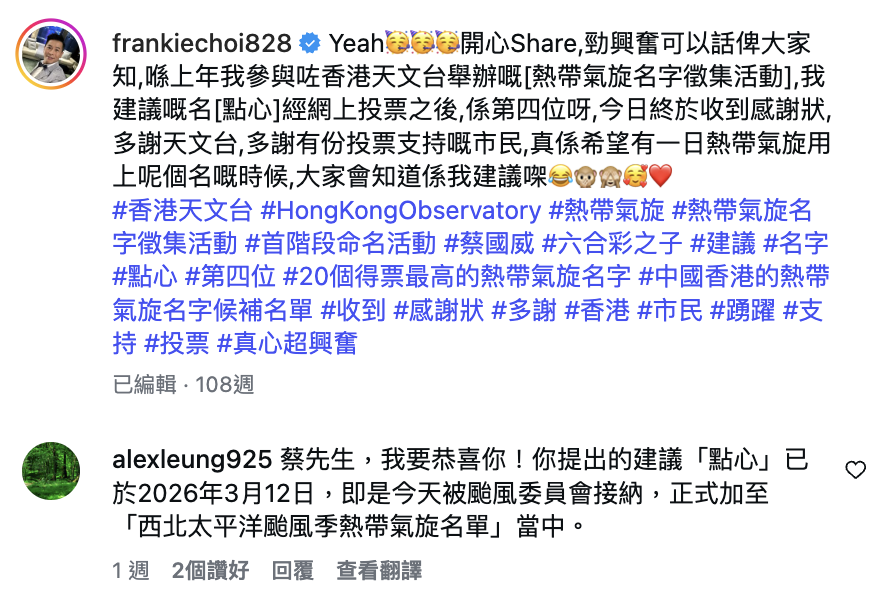 佢仲寫道:「點心」將會代替「萬宜」呀,我真係超開心,有熱帶氣旋名係由我建議,Yeah Yeah Yeah,到時「點心」出現嘅時候,希望佢唔好太強勁,輕輕掠過就得㗎啦,唔好做成嚴重事故或傷亡就得,有一日休息下就梗係最好啦😂🥳🥰🙌🏼💪🏼🙏🏼![]()